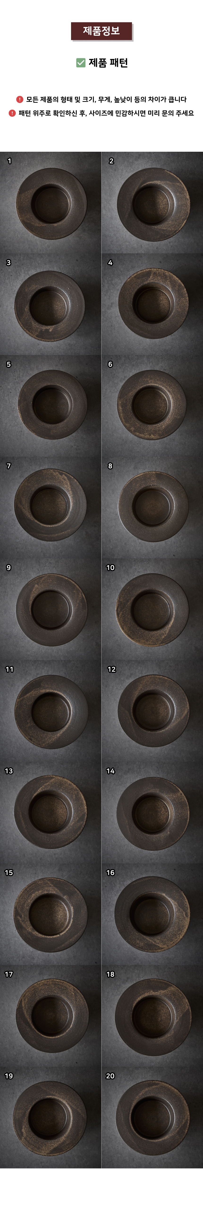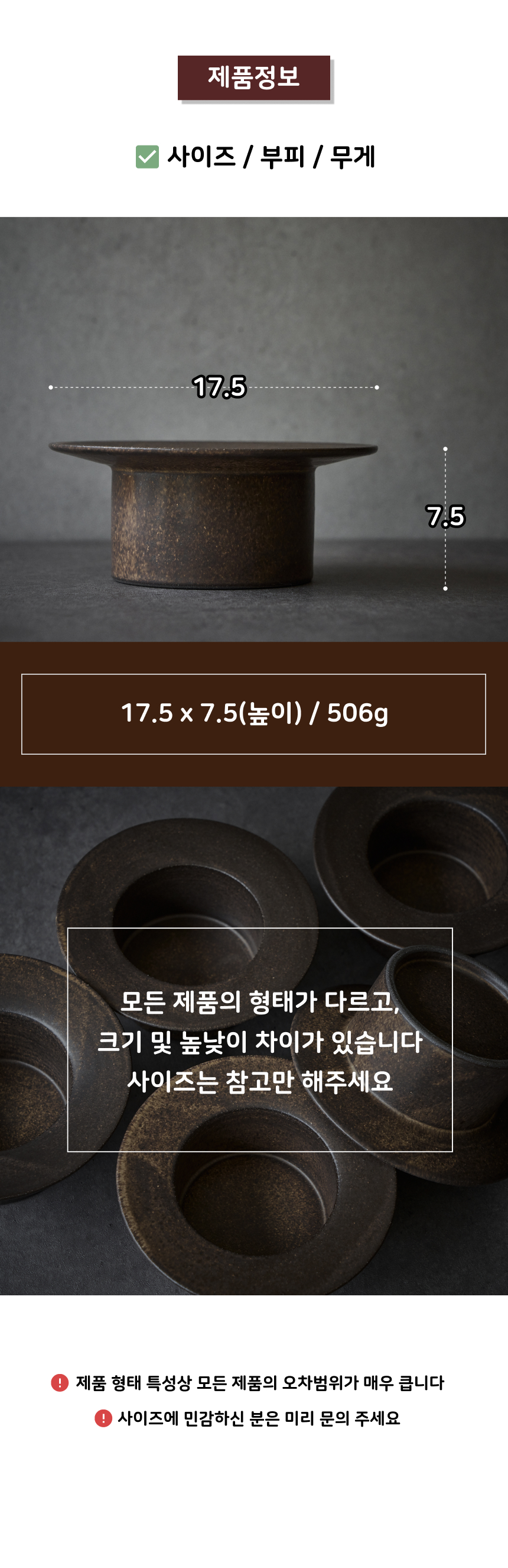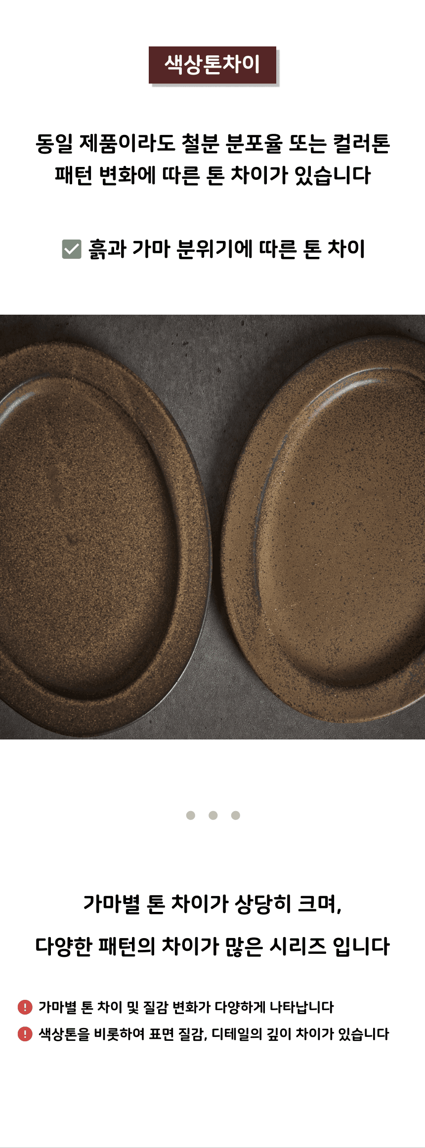 • 가마에서 나올때마다 차이가 있으니, 기계 공산품처럼 깔끔하고 딱 떨어지는 제품을 원하시는 분들께는 구매를 추천드리지 않습니다.