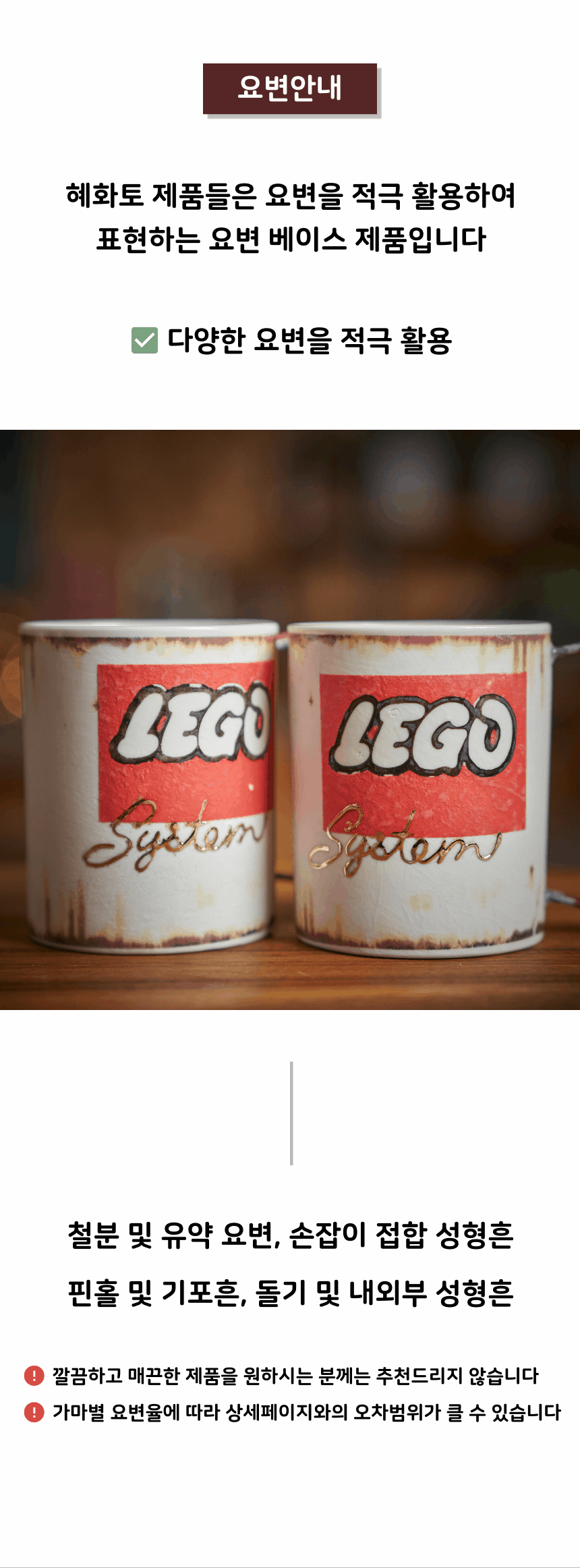 | 색상이 사진과 조금 다릅니다 도자기 제품은 가마에서 나올 때 마다 흙의 종류, 가마의 분위기, 유약 요변의 특성상 조금씩 색상톤의 변화가 있는 제품입니다. 색상에 많이 예민하신 분은 미리 문의하시면 발송가능한 제품의 사진을 찍어 게시판에 올려 드리니 참고 하시기 바랍니다. 철분점이 없는 걸 사고 싶어요 ( 또는 반대의 질문 ) 철분점은 핸드메이드 도자기 제품의 꽃으로서, 자연스러운 표현기법이자 현상입니다. 가마에 따라, 또는 한 가마의 제품이라도 그 수가 적고 많음이 불규칙적으로 표현되오니 이러한 부분에 예민하신 분은 미리 문의해 주시면 발송 가능한 제품의 사진을 찍어 안내 드리니 참고하시기 바랍니다. 구매하고 싶은데 품절이 되었어요! 혜화토는 재고가 부족하지 않도록 항상 노력하고 있습니다. 하지만, 제품마다 제작 방법 및 기법, 유약 작업 등이 다르며 가마 상황에 따라 다양한 변수가 발생하므로 재고의 수량이 원활히 수급되지 않는 경우가 있습니다. 보통 품절되기 전 다음 수량을 입고하기 위해 노력하지만, 때로는 한 가마 전체를 버려야 하는 경우가 생기기도 하는 수작업의 영역이기에 재입고 일정이 늦어지는 경우가 비일비재 합니다. 재입고 일정은 특성상 정확한 일정이 정해지지 않지만, 입고시 알람 문자는 발송해 드리고 있으니 원하시는 재품의 재입고시 알람문자를 받고 싶으시면 문의로 성함 및 연락처, 원하는 제품명을 알려 주시면 문자를 발송해 드립니다. 또한, 네이버톡톡으로도 안내를 받을 수 있으니 톡으로 남겨 주셔도 됩니다. 대량 구매진행은 어떻게 해야 하나요? 혜화토는 여러 작가님과의 계약을 통하여 작품을 판매하는 편집샵입니다. 따라서, 대량 구매의 최소 금액 기준은 작가 및 브랜드별로 상이하며, 사업자 등록증이 없는 경우는 별도 대량구매 안내를 해드릴 수 없습니다. 대량구매 게시판에 포멧에 맞게 문의서를 작성해 주시면 안내해 드리도록 하겠습니다. |