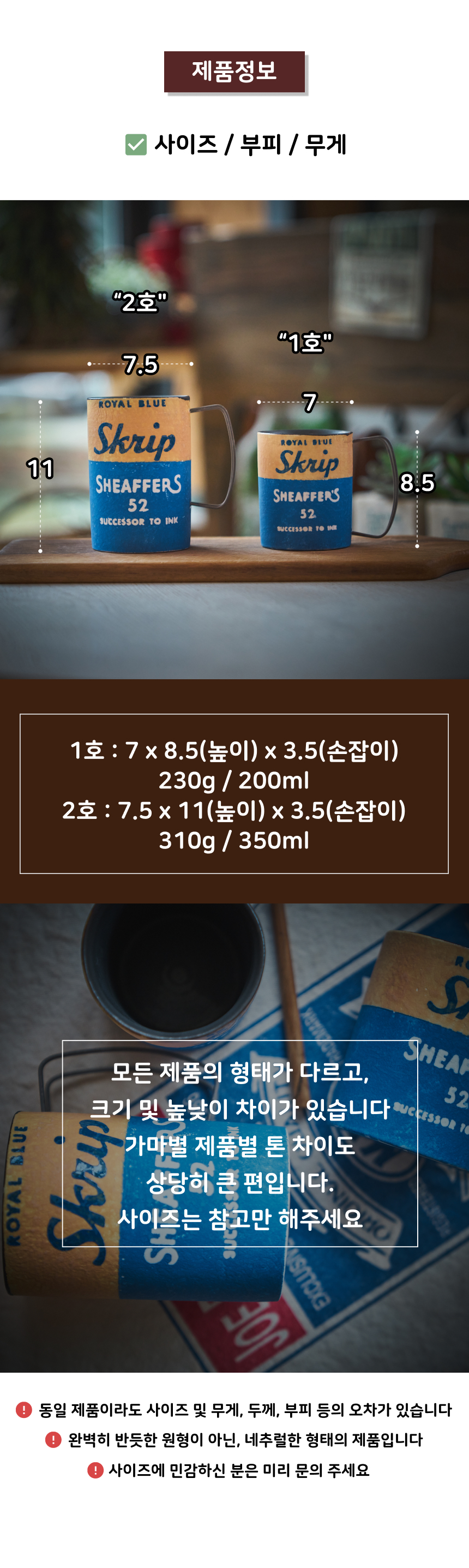 | 핸드메이드 도자기 그릇은 일반적인 공산품과 다릅니다. 가마의 분위기, 매번 달라지는 흙의 속성, 유약의 미세한 비율등 셀 수 없는 많은 요소로 인하여 끊임없이 요변이 일어나는 것이 핸드메이드 도자기 입니다. 상세 페이지와 다른 색상톤, 철분점과 돌기, 기포자국, 물레 형성자국, 가마에 닿는 바닥면의 흠집, 색배임 등등 핸드메이드 그릇 고유의 특징에 대하여 민감하신 분은 구매전 다시 한 번 고려하여 주시기 바랍니다. 온라인 쇼핑몰 특성상 사진이 본래의 제품과 100% 똑같이 나온다고 말씀드릴 순 없습니다. 항상 실제 제품과 같아 보이도록 최선을 다하고 있지만, 촬영 당시의 한 두개의 모델로 촬영된 제품과 꾸준히 생산되며 재입고되는 제품들은 요변에 따라 차이점이 날 수 밖에 없음을 이해해 주시기 바랍니다. 또한, 제품을 검색하는 모니터, 핸드폰의 종류에 따라서도 색상의 차이가 달라지니 이 점 참고하시기 바랍니다. |
