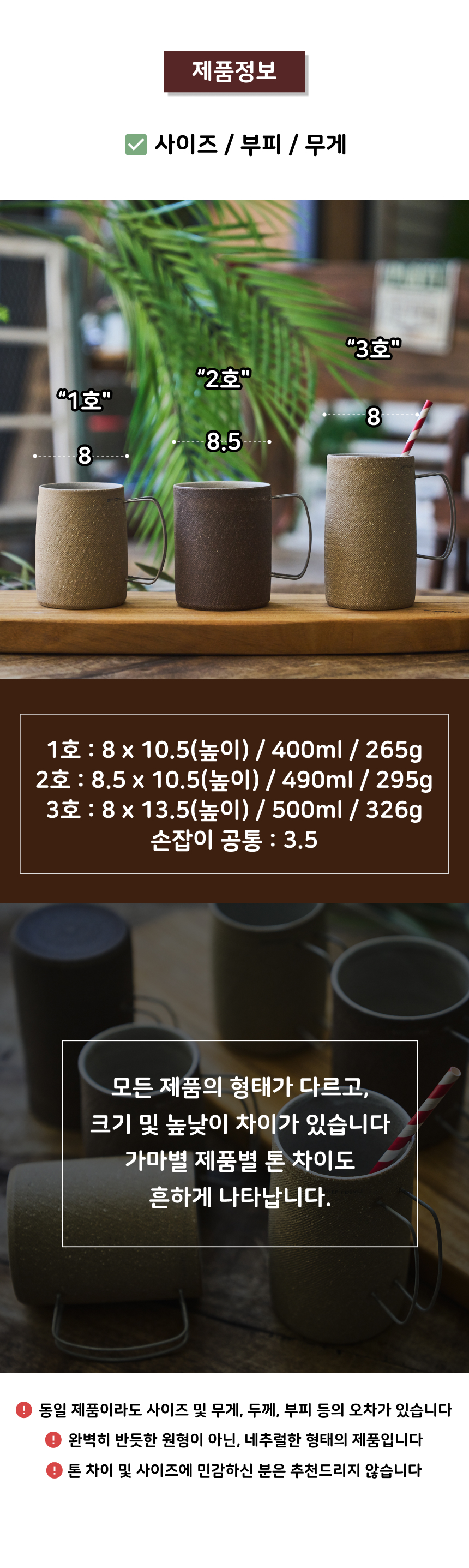 | 핸드메이드 도자기 그릇은 일반적인 공산품과 다릅니다. 가마의 분위기, 매번 달라지는 흙의 속성, 유약의 미세한 비율등 셀 수 없는 많은 요소로 인하여 끊임없이 요변이 일어나는 것이 핸드메이드 도자기 입니다. 상세 페이지와 다른 색상톤, 철분점과 돌기, 기포자국, 물레 형성자국, 가마에 닿는 바닥면의 흠집, 색배임 등등 핸드메이드 그릇 고유의 특징에 대하여 민감하신 분은 구매전 다시 한 번 고려하여 주시기 바랍니다. 온라인 쇼핑몰 특성상 사진이 본래의 제품과 100% 똑같이 나온다고 말씀드릴 순 없습니다. 항상 실제 제품과 같아 보이도록 최선을 다하고 있지만, 촬영 당시의 한 두개의 모델로 촬영된 제품과 꾸준히 생산되며 재입고되는 제품들은 요변에 따라 차이점이 날 수 밖에 없음을 이해해 주시기 바랍니다. 또한, 제품을 검색하는 모니터, 핸드폰의 종류에 따라서도 색상의 차이가 달라지니 이 점 참고하시기 바랍니다. |