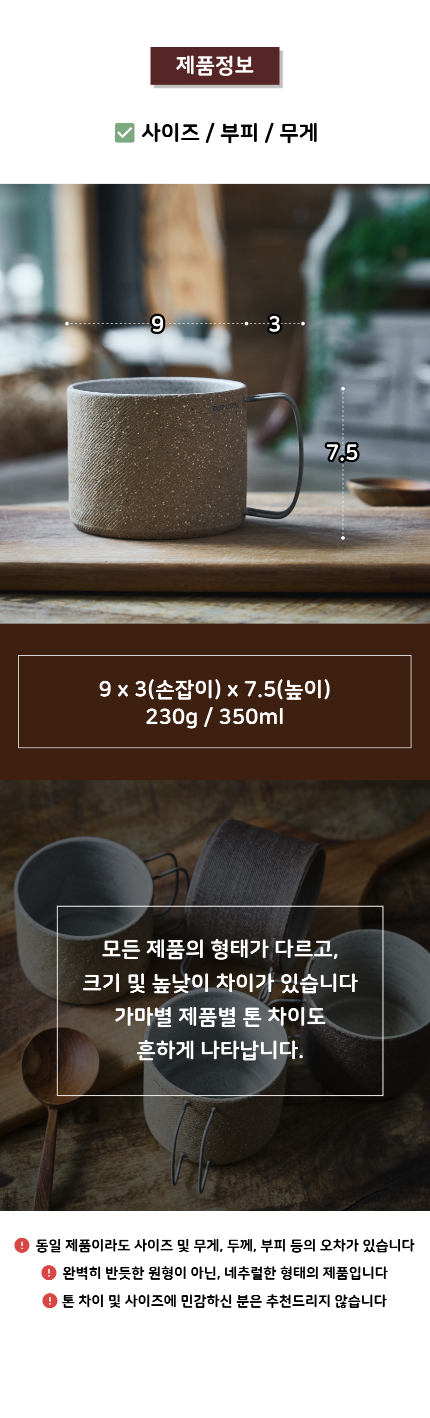 | 핸드메이드 도자기 그릇은 일반적인 공산품과 다릅니다. 가마의 분위기, 매번 달라지는 흙의 속성, 유약의 미세한 비율등 셀 수 없는 많은 요소로 인하여 끊임없이 요변이 일어나는 것이 핸드메이드 도자기 입니다. 상세 페이지와 다른 색상톤, 철분점과 돌기, 기포자국, 물레 형성자국, 가마에 닿는 바닥면의 흠집, 색배임 등등 핸드메이드 그릇 고유의 특징에 대하여 민감하신 분은 구매전 다시 한 번 고려하여 주시기 바랍니다. 온라인 쇼핑몰 특성상 사진이 본래의 제품과 100% 똑같이 나온다고 말씀드릴 순 없습니다. 항상 실제 제품과 같아 보이도록 최선을 다하고 있지만, 촬영 당시의 한 두개의 모델로 촬영된 제품과 꾸준히 생산되며 재입고되는 제품들은 요변에 따라 차이점이 날 수 밖에 없음을 이해해 주시기 바랍니다. 또한, 제품을 검색하는 모니터, 핸드폰의 종류에 따라서도 색상의 차이가 달라지니 이 점 참고하시기 바랍니다. |