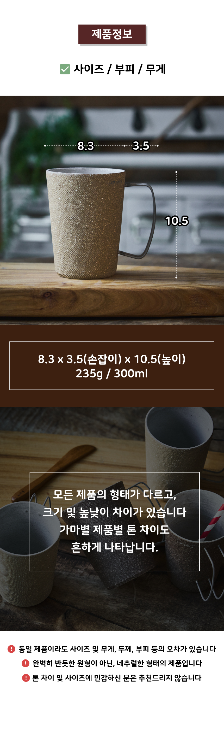 | 핸드메이드 도자기 그릇은 일반적인 공산품과 다릅니다. 가마의 분위기, 매번 달라지는 흙의 속성, 유약의 미세한 비율등 셀 수 없는 많은 요소로 인하여 끊임없이 요변이 일어나는 것이 핸드메이드 도자기 입니다. 상세 페이지와 다른 색상톤, 철분점과 돌기, 기포자국, 물레 형성자국, 가마에 닿는 바닥면의 흠집, 색배임 등등 핸드메이드 그릇 고유의 특징에 대하여 민감하신 분은 구매전 다시 한 번 고려하여 주시기 바랍니다. 온라인 쇼핑몰 특성상 사진이 본래의 제품과 100% 똑같이 나온다고 말씀드릴 순 없습니다. 항상 실제 제품과 같아 보이도록 최선을 다하고 있지만, 촬영 당시의 한 두개의 모델로 촬영된 제품과 꾸준히 생산되며 재입고되는 제품들은 요변에 따라 차이점이 날 수 밖에 없음을 이해해 주시기 바랍니다. 또한, 제품을 검색하는 모니터, 핸드폰의 종류에 따라서도 색상의 차이가 달라지니 이 점 참고하시기 바랍니다. |