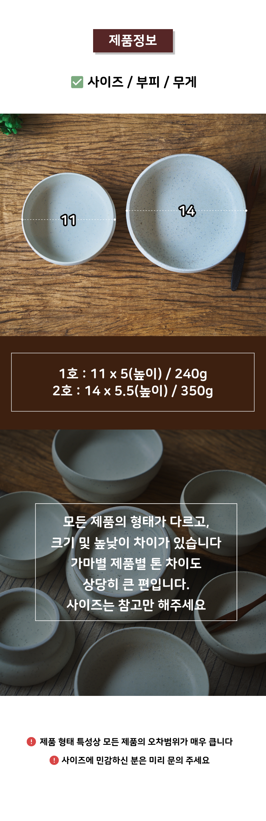 - 가마에서 나올때마다 차이가 있으니, 기계 공산품처럼 깔끔하고 딱 떨어지는 제품을 원하시는 분들께는 구매를 추천드리지 않습니다.