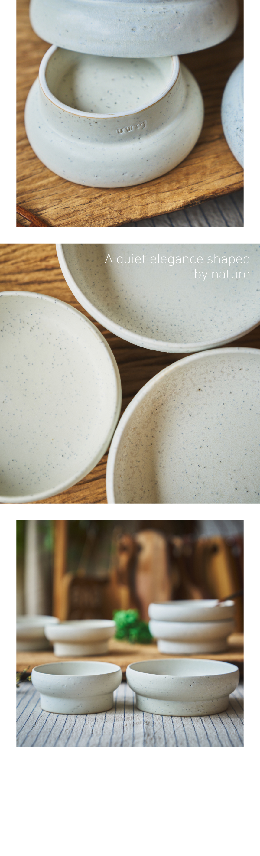 | 핸드메이드 도자기 그릇은 일반적인 공산품과 다릅니다. 가마의 분위기, 매번 달라지는 흙의 속성, 유약의 미세한 비율등 셀 수 없는 많은 요소로 인하여 끊임없이 요변이 일어나는 것이 핸드메이드 도자기 입니다. 상세 페이지와 다른 색상톤, 철분점과 돌기, 기포자국, 물레 형성자국, 가마에 닿는 바닥면의 흠집, 색배임 등등 핸드메이드 그릇 고유의 특징에 대하여 민감하신 분은 구매전 다시 한 번 고려하여 주시기 바랍니다. 온라인 쇼핑몰 특성상 사진이 본래의 제품과 100% 똑같이 나온다고 말씀드릴 순 없습니다. 항상 실제 제품과 같아 보이도록 최선을 다하고 있지만, 촬영 당시의 한 두개의 모델로 촬영된 제품과 꾸준히 생산되며 재입고되는 제품들은 요변에 따라 차이점이 날 수 밖에 없음을 이해해 주시기 바랍니다. 또한, 제품을 검색하는 모니터, 핸드폰의 종류에 따라서도 색상의 차이가 달라지니 이 점 참고하시기 바랍니다. |