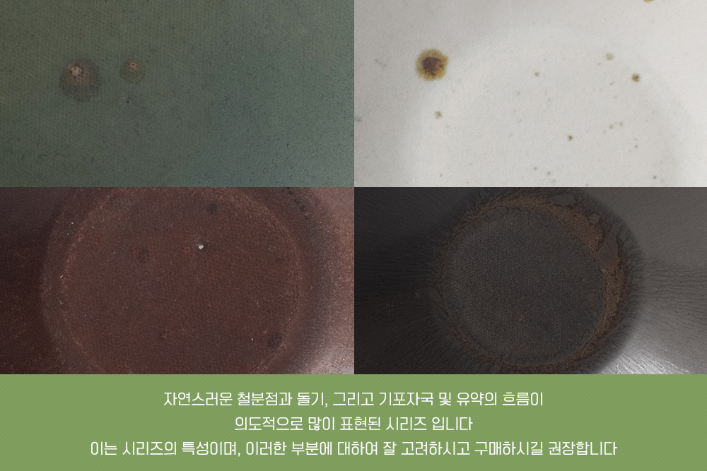 작은 돌기나 기포 자국, 유약이 흐른 자국, 성형 과정 중 변형된 부분 등 핸드메이드 도자기에 나타나는 자연스러운 현상이며, 하자가 아님을 알려드립니다.