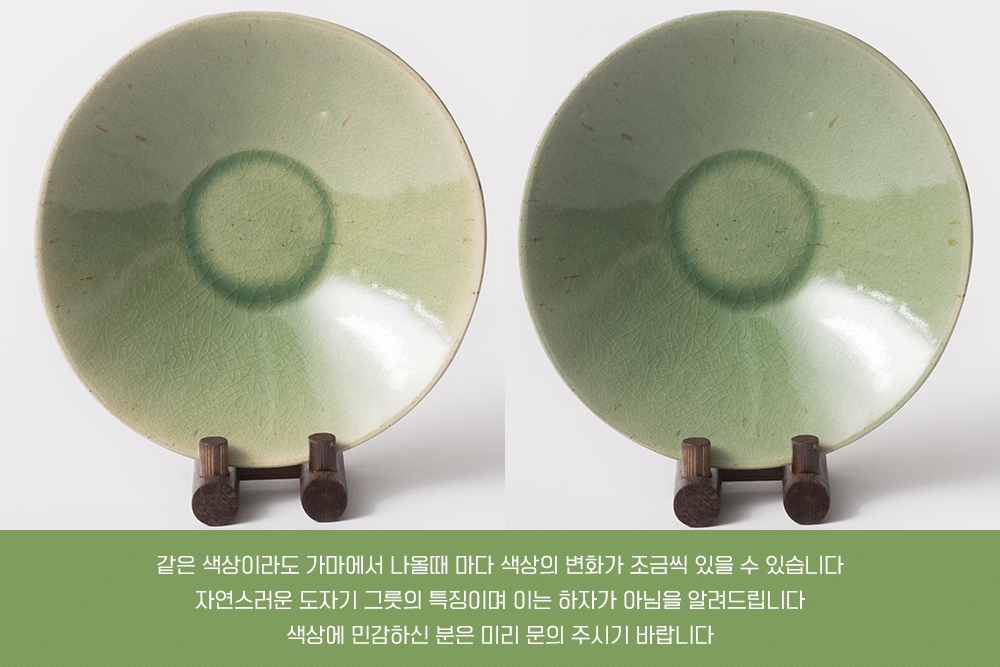 | 핸드메이드 도자기 그릇은 일반적인 공산품과 다릅니다. 가마의 분위기, 매번 달라지는 흙의 속성, 유약의 미세한 비율등 셀 수 없는 많은 요소로 인하여 끊임없이 요변이 일어나는 것이 핸드메이드 도자기 입니다. 상세 페이지와 다른 색상톤, 철분점과 돌기, 기포자국, 물레 형성자국, 가마에 닿는 바닥면의 흠집, 색배임 등등 핸드메이드 그릇 고유의 특징에 대하여 민감하신 분은 구매전 다시 한 번 고려하여 주시기 바랍니다. 온라인 쇼핑몰 특성상 사진이 본래의 제품과 100% 똑같이 나온다고 말씀드릴 순 없습니다. 항상 실제 제품과 같아 보이도록 최선을 다하고 있지만, 촬영 당시의 한 두개의 모델로 촬영된 제품과 꾸준히 생산되며 재입고되는 제품들은 요변에 따라 차이점이 날 수 밖에 없음을 이해해 주시기 바랍니다. 또한, 제품을 검색하는 모니터, 핸드폰의 종류에 따라서도 색상의 차이가 달라지니 이 점 참고하시기 바랍니다. |