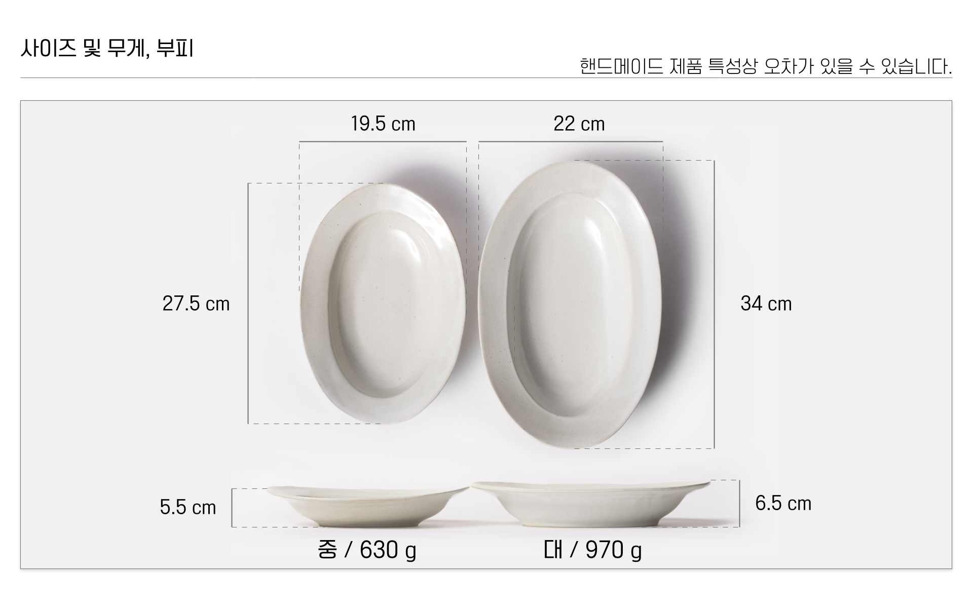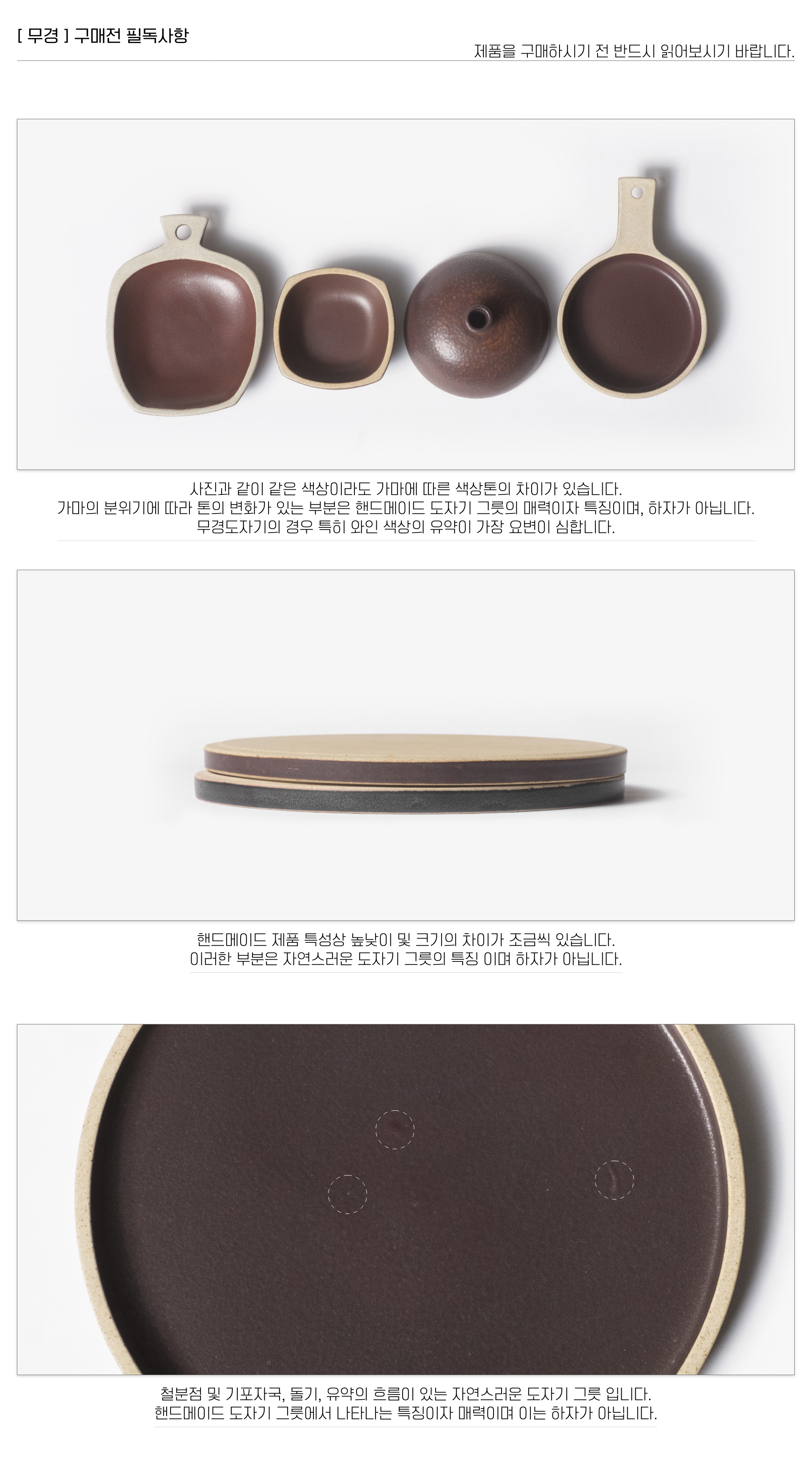 | 핸드메이드 도자기 그릇은 일반적인 공산품과 다릅니다. 가마의 분위기, 매번 달라지는 흙의 속성, 유약의 미세한 비율등 셀 수 없는 많은 요소로 인하여 끊임없이 요변이 일어나는 것이 핸드메이드 도자기 입니다. 상세 페이지와 다른 색상톤, 철분점과 돌기, 기포자국, 물레 형성자국, 가마에 닿는 바닥면의 흠집, 색배임 등등 핸드메이드 그릇 고유의 특징에 대하여 민감하신 분은 구매전 다시 한 번 고려하여 주시기 바랍니다. 온라인 쇼핑몰 특성상 사진이 본래의 제품과 100% 똑같이 나온다고 말씀드릴 순 없습니다. 항상 실제 제품과 같아 보이도록 최선을 다하고 있지만, 촬영 당시의 한 두개의 모델로 촬영된 제품과 꾸준히 생산되며 재입고되는 제품들은 요변에 따라 차이점이 날 수 밖에 없음을 이해해 주시기 바랍니다. 또한, 제품을 검색하는 모니터, 핸드폰의 종류에 따라서도 색상의 차이가 달라지니 이 점 참고하시기 바랍니다. |
