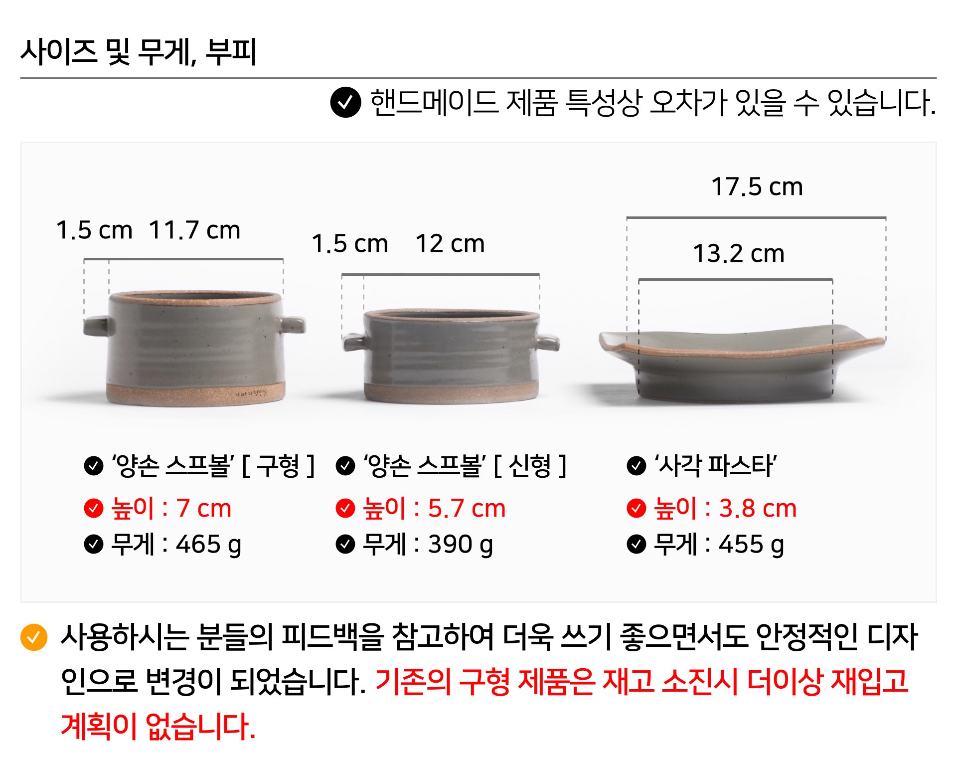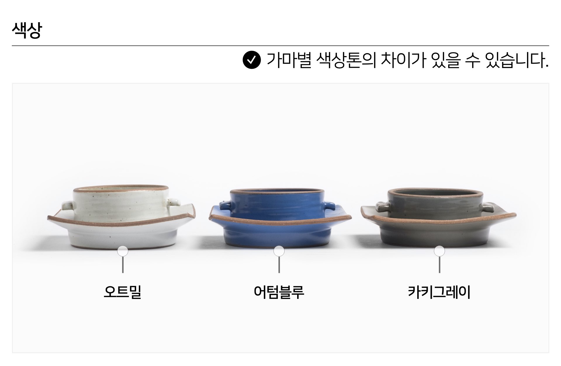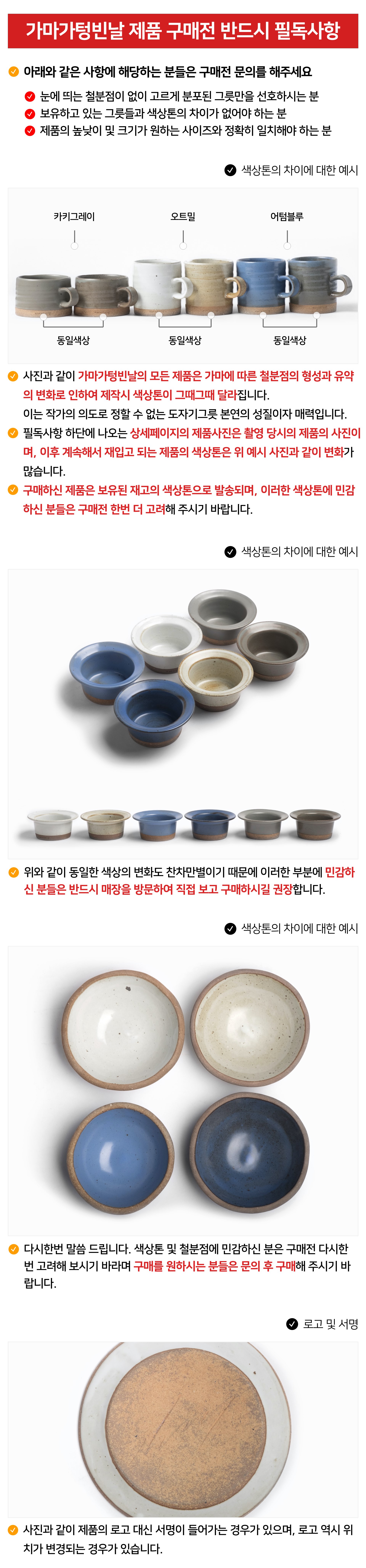 | 핸드메이드 도자기 그릇은 일반적인 공산품과 다릅니다. 가마의 분위기, 매번 달라지는 흙의 속성, 유약의 미세한 비율등 셀 수 없는 많은 요소로 인하여 끊임없이 요변이 일어나는 것이 핸드메이드 도자기 입니다. 상세 페이지와 다른 색상톤, 철분점과 돌기, 기포자국, 물레 형성자국, 가마에 닿는 바닥면의 흠집, 색배임 등등 핸드메이드 그릇 고유의 특징에 대하여 민감하신 분은 구매전 다시 한 번 고려하여 주시기 바랍니다. 온라인 쇼핑몰 특성상 사진이 본래의 제품과 100% 똑같이 나온다고 말씀드릴 순 없습니다. 항상 실제 제품과 같아 보이도록 최선을 다하고 있지만, 촬영 당시의 한 두개의 모델로 촬영된 제품과 꾸준히 생산되며 재입고되는 제품들은 요변에 따라 차이점이 날 수 밖에 없음을 이해해 주시기 바랍니다. 또한, 제품을 검색하는 모니터, 핸드폰의 종류에 따라서도 색상의 차이가 달라지니 이 점 참고하시기 바랍니다. |