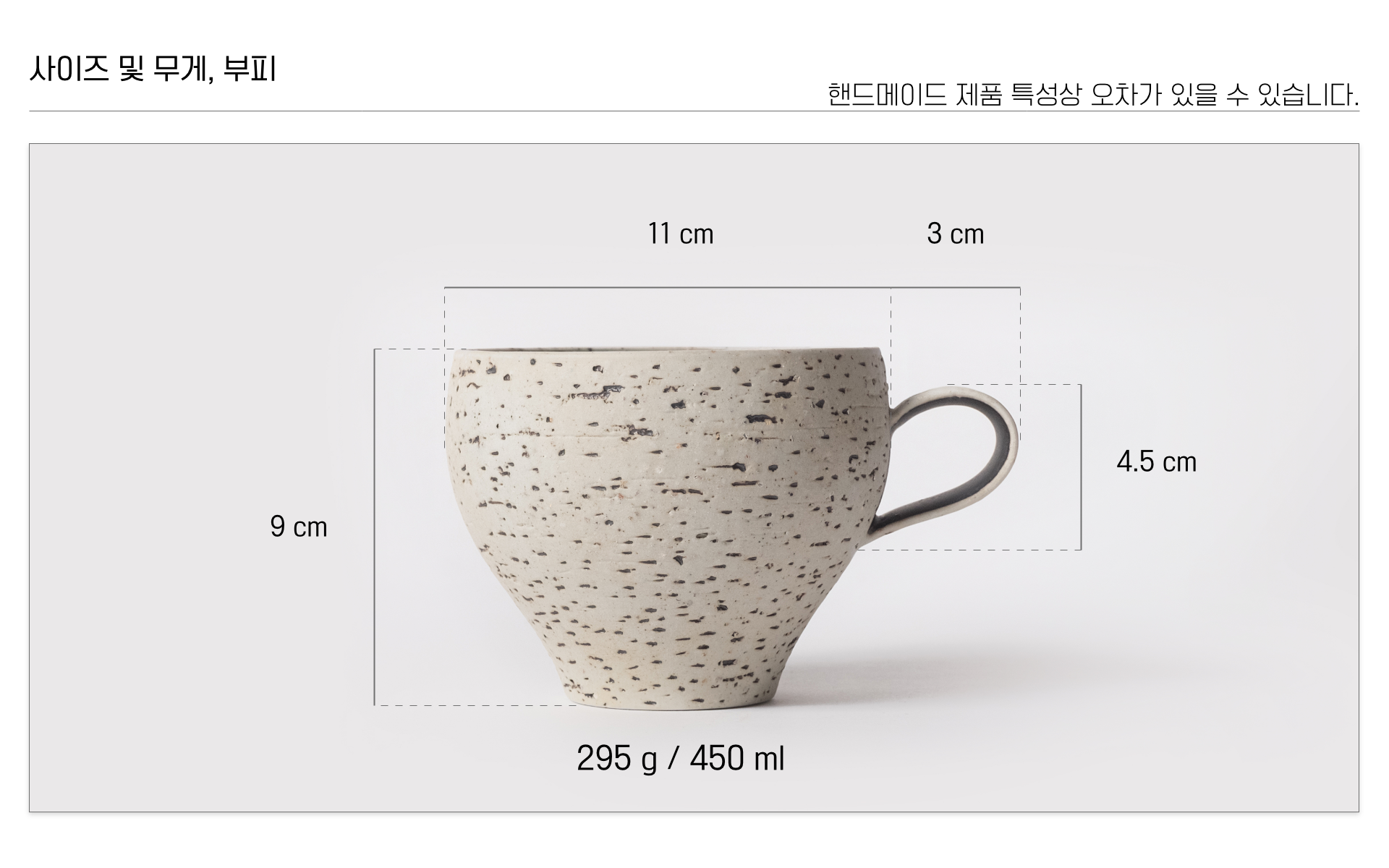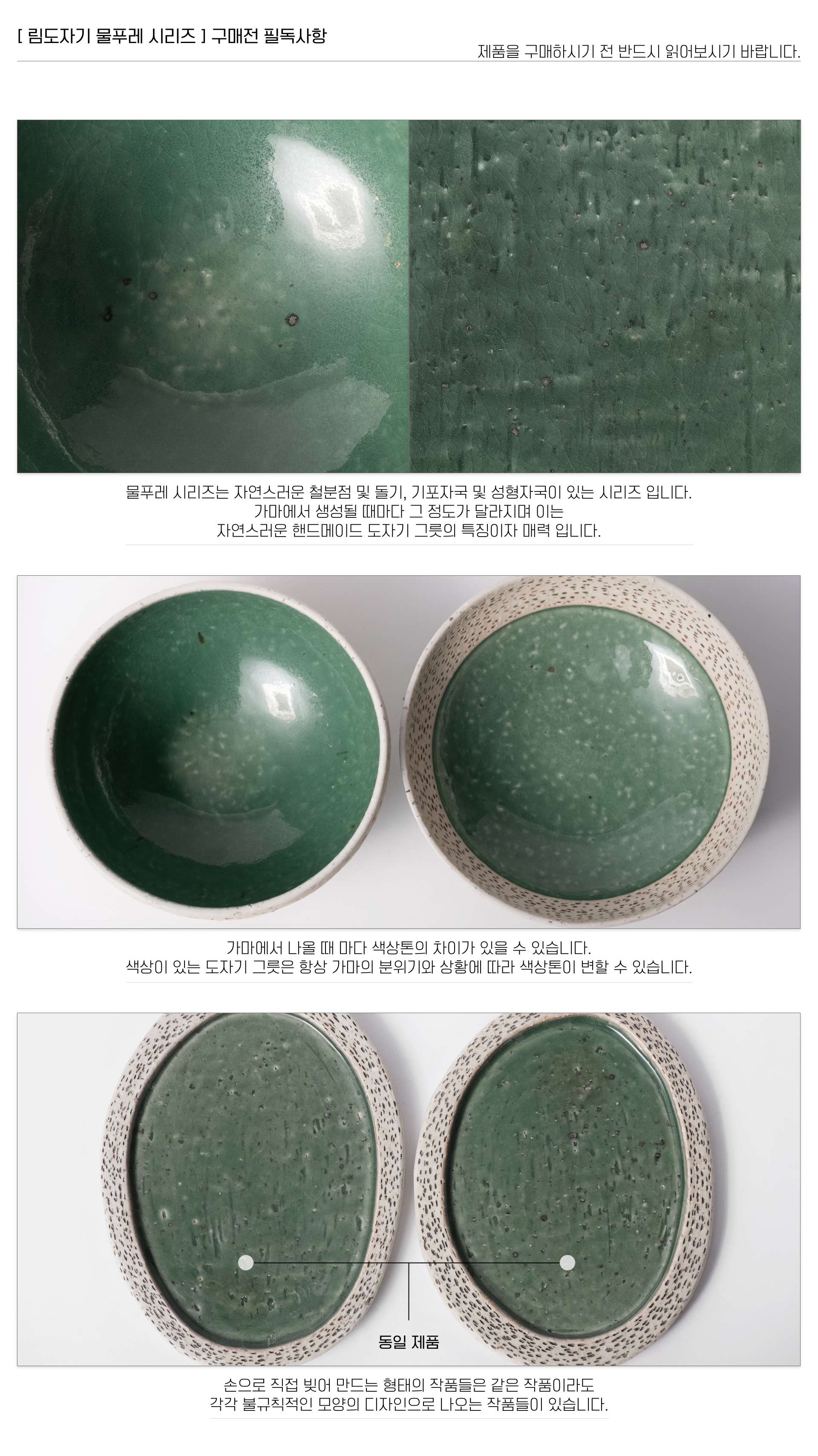 | 핸드메이드 도자기 그릇은 일반적인 공산품과 다릅니다. 가마의 분위기, 매번 달라지는 흙의 속성, 유약의 미세한 비율등 셀 수 없는 많은 요소로 인하여 끊임없이 요변이 일어나는 것이 핸드메이드 도자기 입니다. 상세 페이지와 다른 색상톤, 철분점과 돌기, 기포자국, 물레 형성자국, 가마에 닿는 바닥면의 흠집, 색배임 등등 핸드메이드 그릇 고유의 특징에 대하여 민감하신 분은 구매전 다시 한 번 고려하여 주시기 바랍니다. 온라인 쇼핑몰 특성상 사진이 본래의 제품과 100% 똑같이 나온다고 말씀드릴 순 없습니다. 항상 실제 제품과 같아 보이도록 최선을 다하고 있지만, 촬영 당시의 한 두개의 모델로 촬영된 제품과 꾸준히 생산되며 재입고되는 제품들은 요변에 따라 차이점이 날 수 밖에 없음을 이해해 주시기 바랍니다. 또한, 제품을 검색하는 모니터, 핸드폰의 종류에 따라서도 색상의 차이가 달라지니 이 점 참고하시기 바랍니다. |