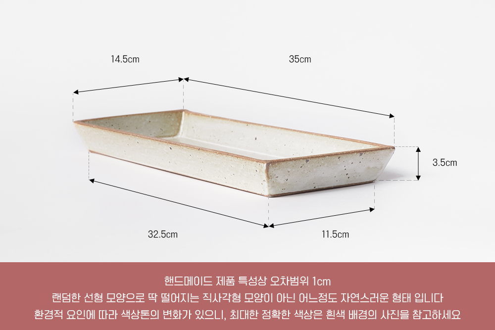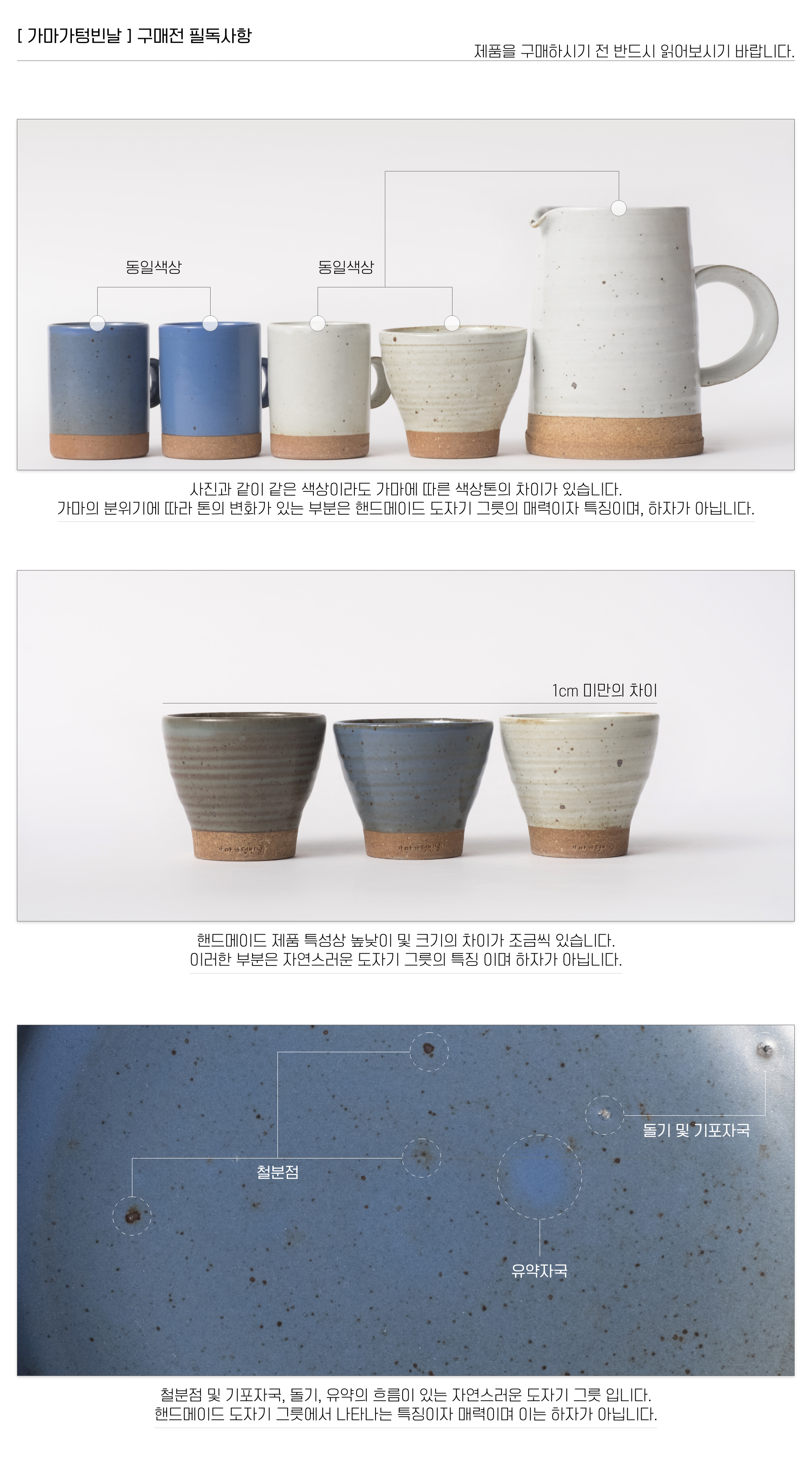 | 핸드메이드 도자기 그릇은 일반적인 공산품과 다릅니다. 가마의 분위기, 매번 달라지는 흙의 속성, 유약의 미세한 비율등 셀 수 없는 많은 요소로 인하여 끊임없이 요변이 일어나는 것이 핸드메이드 도자기 입니다. 상세 페이지와 다른 색상톤, 철분점과 돌기, 기포자국, 물레 형성자국, 가마에 닿는 바닥면의 흠집, 색배임 등등 핸드메이드 그릇 고유의 특징에 대하여 민감하신 분은 구매전 다시 한 번 고려하여 주시기 바랍니다. 온라인 쇼핑몰 특성상 사진이 본래의 제품과 100% 똑같이 나온다고 말씀드릴 순 없습니다. 항상 실제 제품과 같아 보이도록 최선을 다하고 있지만, 촬영 당시의 한 두개의 모델로 촬영된 제품과 꾸준히 생산되며 재입고되는 제품들은 요변에 따라 차이점이 날 수 밖에 없음을 이해해 주시기 바랍니다. 또한, 제품을 검색하는 모니터, 핸드폰의 종류에 따라서도 색상의 차이가 달라지니 이 점 참고하시기 바랍니다. |