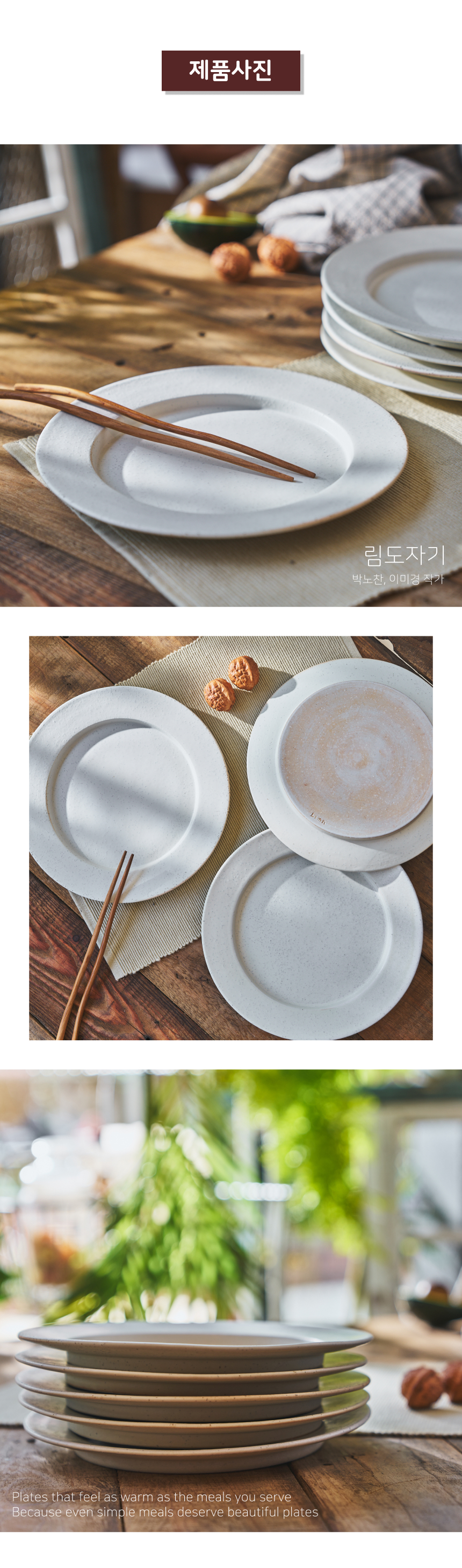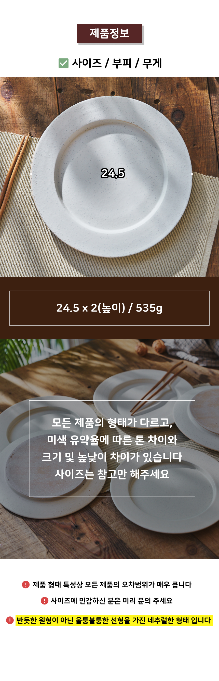 | 핸드메이드 도자기 그릇은 일반적인 공산품과 다릅니다. 가마의 분위기, 매번 달라지는 흙의 속성, 유약의 미세한 비율등 셀 수 없는 많은 요소로 인하여 끊임없이 요변이 일어나는 것이 핸드메이드 도자기 입니다. 상세 페이지와 다른 색상톤, 철분점과 돌기, 기포자국, 물레 형성자국, 가마에 닿는 바닥면의 흠집, 색배임 등등 핸드메이드 그릇 고유의 특징에 대하여 민감하신 분은 구매전 다시 한 번 고려하여 주시기 바랍니다. 온라인 쇼핑몰 특성상 사진이 본래의 제품과 100% 똑같이 나온다고 말씀드릴 순 없습니다. 항상 실제 제품과 같아 보이도록 최선을 다하고 있지만, 촬영 당시의 한 두개의 모델로 촬영된 제품과 꾸준히 생산되며 재입고되는 제품들은 요변에 따라 차이점이 날 수 밖에 없음을 이해해 주시기 바랍니다. 또한, 제품을 검색하는 모니터, 핸드폰의 종류에 따라서도 색상의 차이가 달라지니 이 점 참고하시기 바랍니다. |