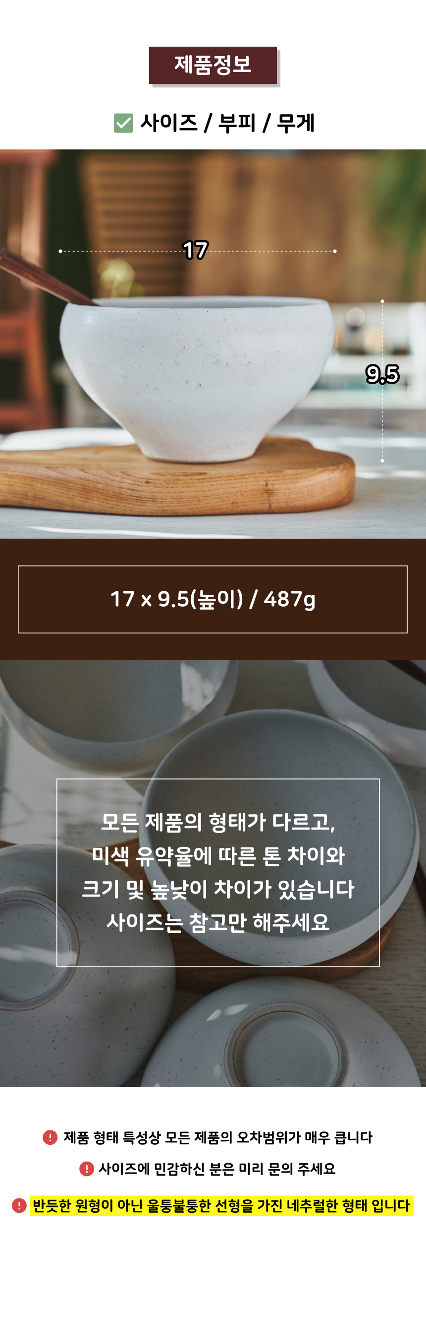 | 핸드메이드 도자기 그릇은 일반적인 공산품과 다릅니다. 가마의 분위기, 매번 달라지는 흙의 속성, 유약의 미세한 비율등 셀 수 없는 많은 요소로 인하여 끊임없이 요변이 일어나는 것이 핸드메이드 도자기 입니다. 상세 페이지와 다른 색상톤, 철분점과 돌기, 기포자국, 물레 형성자국, 가마에 닿는 바닥면의 흠집, 색배임 등등 핸드메이드 그릇 고유의 특징에 대하여 민감하신 분은 구매전 다시 한 번 고려하여 주시기 바랍니다. 온라인 쇼핑몰 특성상 사진이 본래의 제품과 100% 똑같이 나온다고 말씀드릴 순 없습니다. 항상 실제 제품과 같아 보이도록 최선을 다하고 있지만, 촬영 당시의 한 두개의 모델로 촬영된 제품과 꾸준히 생산되며 재입고되는 제품들은 요변에 따라 차이점이 날 수 밖에 없음을 이해해 주시기 바랍니다. 또한, 제품을 검색하는 모니터, 핸드폰의 종류에 따라서도 색상의 차이가 달라지니 이 점 참고하시기 바랍니다. |