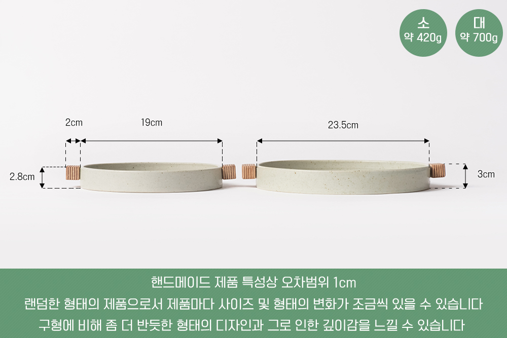 | 핸드메이드 도자기 그릇은 일반적인 공산품과 다릅니다. 가마의 분위기, 매번 달라지는 흙의 속성, 유약의 미세한 비율등 셀 수 없는 많은 요소로 인하여 끊임없이 요변이 일어나는 것이 핸드메이드 도자기 입니다. 상세 페이지와 다른 색상톤, 철분점과 돌기, 기포자국, 물레 형성자국, 가마에 닿는 바닥면의 흠집, 색배임 등등 핸드메이드 그릇 고유의 특징에 대하여 민감하신 분은 구매전 다시 한 번 고려하여 주시기 바랍니다. 온라인 쇼핑몰 특성상 사진이 본래의 제품과 100% 똑같이 나온다고 말씀드릴 순 없습니다. 항상 실제 제품과 같아 보이도록 최선을 다하고 있지만, 촬영 당시의 한 두개의 모델로 촬영된 제품과 꾸준히 생산되며 재입고되는 제품들은 요변에 따라 차이점이 날 수 밖에 없음을 이해해 주시기 바랍니다. 또한, 제품을 검색하는 모니터, 핸드폰의 종류에 따라서도 색상의 차이가 달라지니 이 점 참고하시기 바랍니다. |