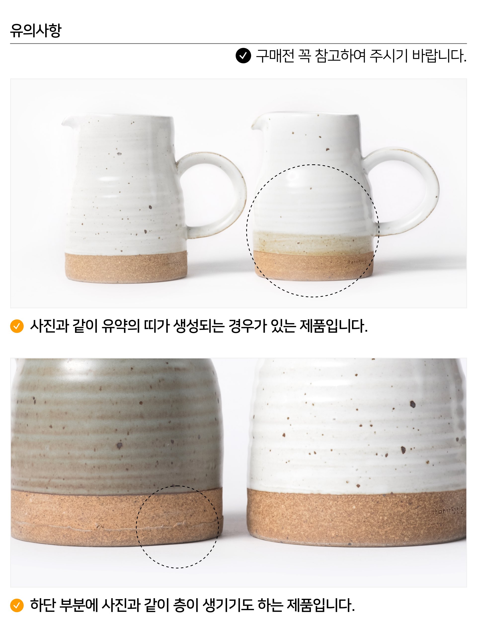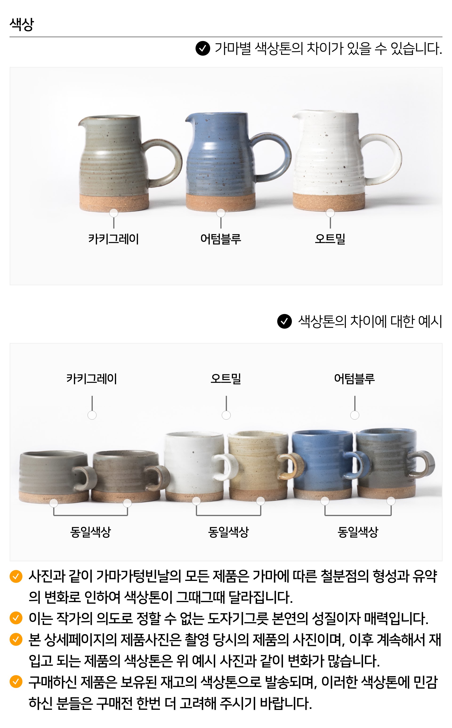 | 핸드메이드 도자기 그릇은 일반적인 공산품과 다릅니다. 가마의 분위기, 매번 달라지는 흙의 속성, 유약의 미세한 비율등 셀 수 없는 많은 요소로 인하여 끊임없이 요변이 일어나는 것이 핸드메이드 도자기 입니다. 상세 페이지와 다른 색상톤, 철분점과 돌기, 기포자국, 물레 형성자국, 가마에 닿는 바닥면의 흠집, 색배임 등등 핸드메이드 그릇 고유의 특징에 대하여 민감하신 분은 구매전 다시 한 번 고려하여 주시기 바랍니다. 온라인 쇼핑몰 특성상 사진이 본래의 제품과 100% 똑같이 나온다고 말씀드릴 순 없습니다. 항상 실제 제품과 같아 보이도록 최선을 다하고 있지만, 촬영 당시의 한 두개의 모델로 촬영된 제품과 꾸준히 생산되며 재입고되는 제품들은 요변에 따라 차이점이 날 수 밖에 없음을 이해해 주시기 바랍니다. 또한, 제품을 검색하는 모니터, 핸드폰의 종류에 따라서도 색상의 차이가 달라지니 이 점 참고하시기 바랍니다. |