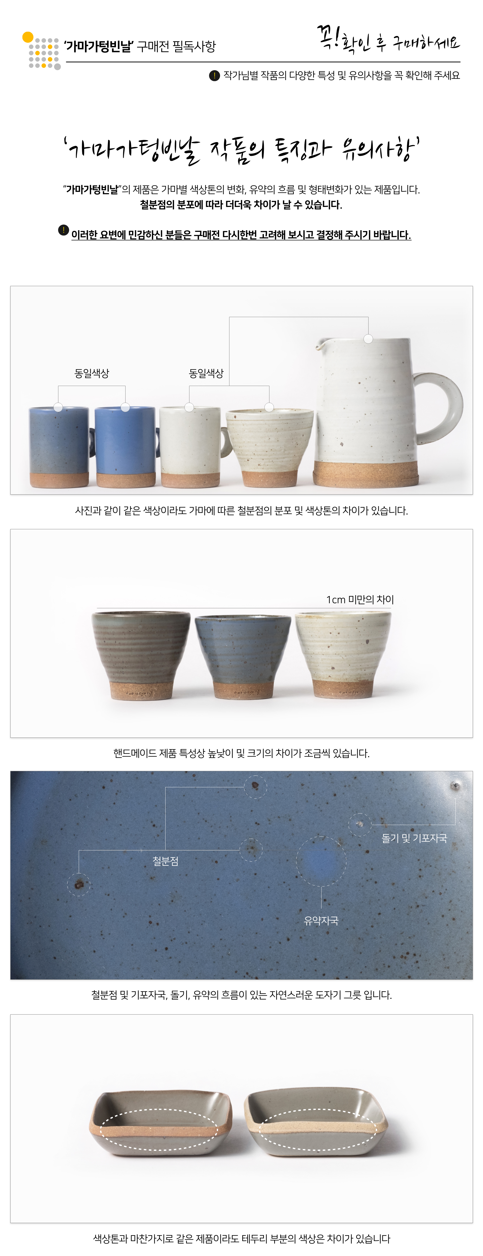 | 핸드메이드 도자기 그릇은 일반적인 공산품과 다릅니다. 가마의 분위기, 매번 달라지는 흙의 속성, 유약의 미세한 비율등 셀 수 없는 많은 요소로 인하여 끊임없이 요변이 일어나는 것이 핸드메이드 도자기 입니다. 상세 페이지와 다른 색상톤, 철분점과 돌기, 기포자국, 물레 형성자국, 가마에 닿는 바닥면의 흠집, 색배임 등등 핸드메이드 그릇 고유의 특징에 대하여 민감하신 분은 구매전 다시 한 번 고려하여 주시기 바랍니다. 온라인 쇼핑몰 특성상 사진이 본래의 제품과 100% 똑같이 나온다고 말씀드릴 순 없습니다. 항상 실제 제품과 같아 보이도록 최선을 다하고 있지만, 촬영 당시의 한 두개의 모델로 촬영된 제품과 꾸준히 생산되며 재입고되는 제품들은 요변에 따라 차이점이 날 수 밖에 없음을 이해해 주시기 바랍니다. 또한, 제품을 검색하는 모니터, 핸드폰의 종류에 따라서도 색상의 차이가 달라지니 이 점 참고하시기 바랍니다. |