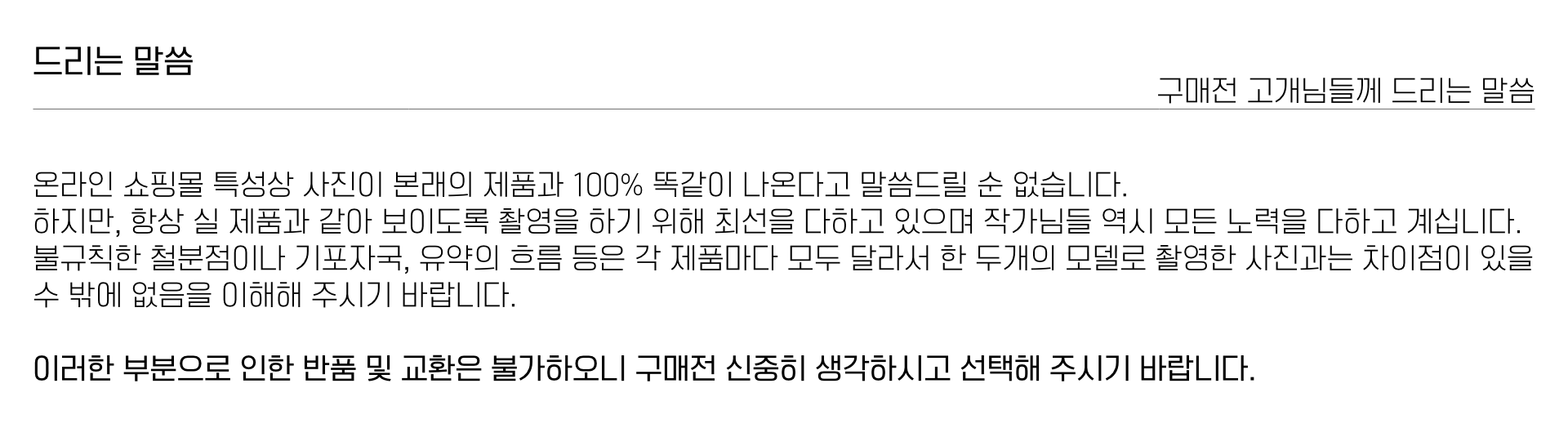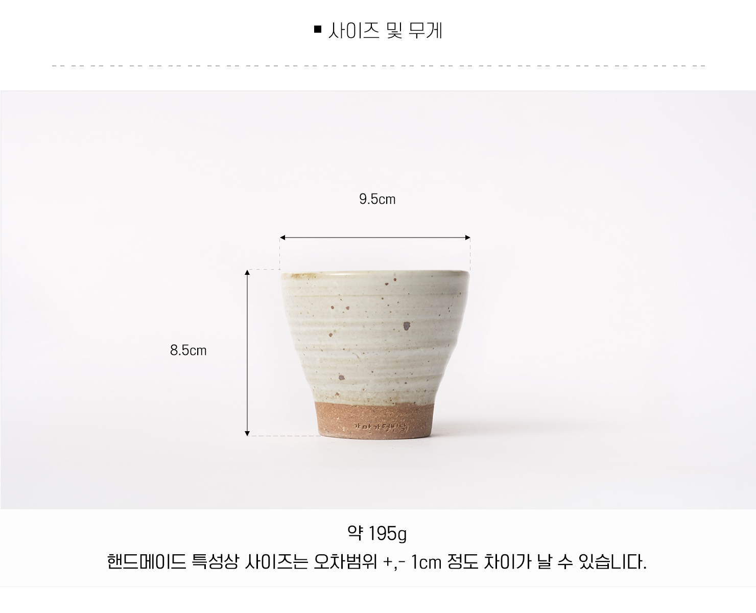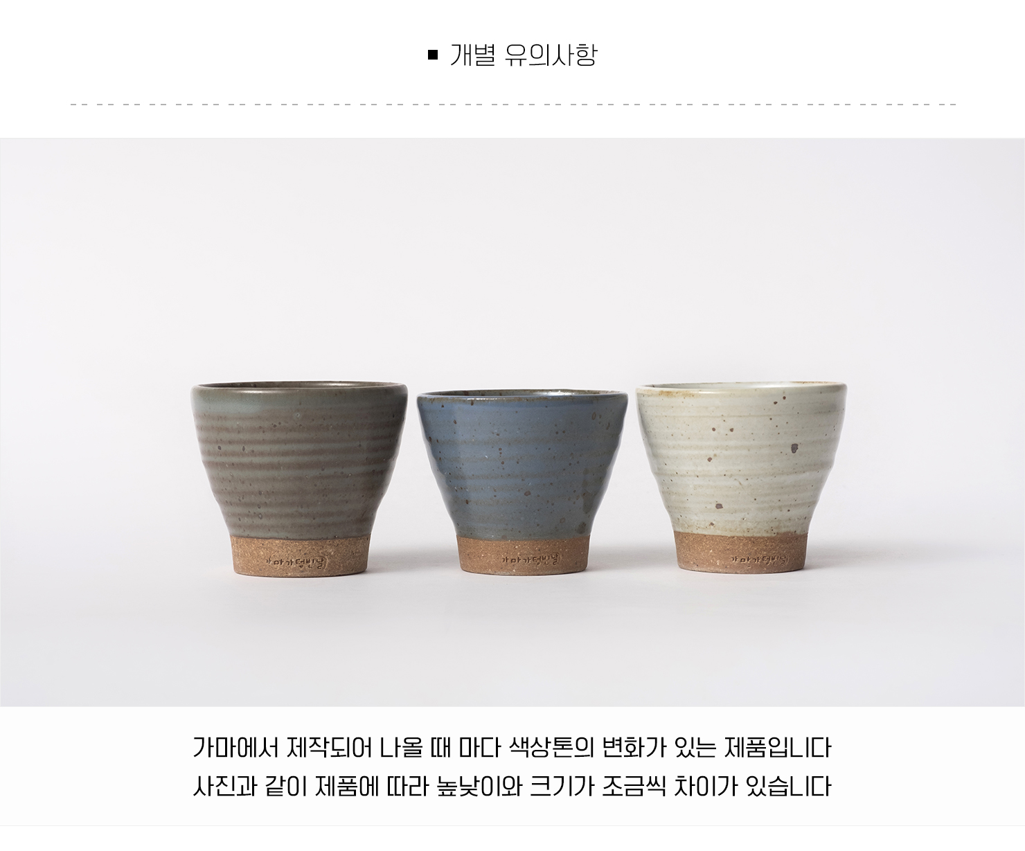 | 핸드메이드 도자기 그릇은 일반적인 공산품과 다릅니다. 가마의 분위기, 매번 달라지는 흙의 속성, 유약의 미세한 비율등 셀 수 없는 많은 요소로 인하여 끊임없이 요변이 일어나는 것이 핸드메이드 도자기 입니다. 상세 페이지와 다른 색상톤, 철분점과 돌기, 기포자국, 물레 형성자국, 가마에 닿는 바닥면의 흠집, 색배임 등등 핸드메이드 그릇 고유의 특징에 대하여 민감하신 분은 구매전 다시 한 번 고려하여 주시기 바랍니다. 온라인 쇼핑몰 특성상 사진이 본래의 제품과 100% 똑같이 나온다고 말씀드릴 순 없습니다. 항상 실제 제품과 같아 보이도록 최선을 다하고 있지만, 촬영 당시의 한 두개의 모델로 촬영된 제품과 꾸준히 생산되며 재입고되는 제품들은 요변에 따라 차이점이 날 수 밖에 없음을 이해해 주시기 바랍니다. 또한, 제품을 검색하는 모니터, 핸드폰의 종류에 따라서도 색상의 차이가 달라지니 이 점 참고하시기 바랍니다. |