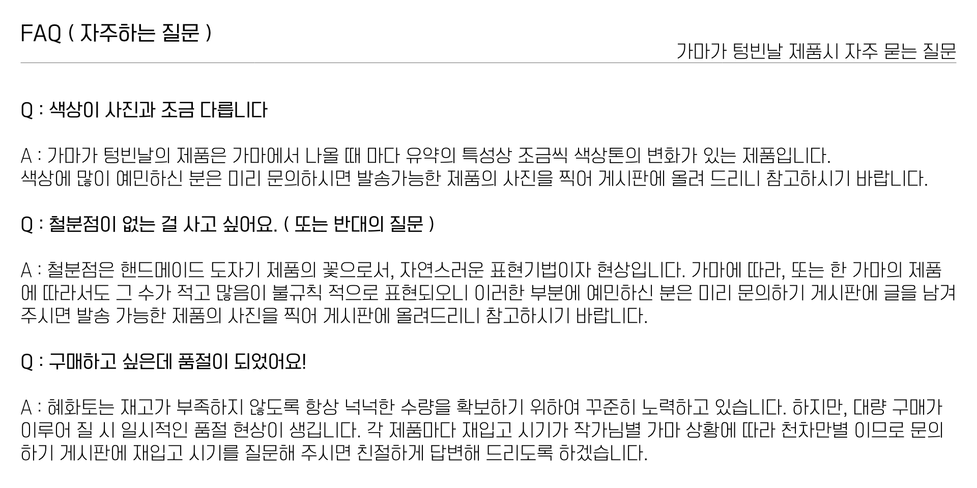 | 색상이 사진과 조금 다릅니다 도자기 제품은 가마에서 나올 때 마다 흙의 종류, 가마의 분위기, 유약 요변의 특성상 조금씩 색상톤의 변화가 있는 제품입니다. 색상에 많이 예민하신 분은 미리 문의하시면 발송가능한 제품의 사진을 찍어 게시판에 올려 드리니 참고 하시기 바랍니다. 철분점이 없는 걸 사고 싶어요 ( 또는 반대의 질문 ) 철분점은 핸드메이드 도자기 제품의 꽃으로서, 자연스러운 표현기법이자 현상입니다. 가마에 따라, 또는 한 가마의 제품이라도 그 수가 적고 많음이 불규칙적으로 표현되오니 이러한 부분에 예민하신 분은 미리 문의해 주시면 발송 가능한 제품의 사진을 찍어 안내 드리니 참고하시기 바랍니다. 구매하고 싶은데 품절이 되었어요! 혜화토는 재고가 부족하지 않도록 항상 노력하고 있습니다. 하지만, 제품마다 제작 방법 및 기법, 유약 작업 등이 다르며 가마 상황에 따라 다양한 변수가 발생하므로 재고의 수량이 원활히 수급되지 않는 경우가 있습니다. 보통 품절되기 전 다음 수량을 입고하기 위해 노력하지만, 때로는 한 가마 전체를 버려야 하는 경우가 생기기도 하는 수작업의 영역이기에 재입고 일정이 늦어지는 경우가 비일비재 합니다. 재입고 일정은 특성상 정확한 일정이 정해지지 않지만, 입고시 알람 문자는 발송해 드리고 있으니 원하시는 재품의 재입고시 알람문자를 받고 싶으시면 문의로 성함 및 연락처, 원하는 제품명을 알려 주시면 문자를 발송해 드립니다. 또한, 네이버톡톡으로도 안내를 받을 수 있으니 톡으로 남겨 주셔도 됩니다. 대량 구매진행은 어떻게 해야 하나요? 혜화토는 여러 작가님과의 계약을 통하여 작품을 판매하는 편집샵입니다. 따라서, 대량 구매의 최소 금액 기준은 작가 및 브랜드별로 상이하며, 사업자 등록증이 없는 경우는 별도 대량구매 안내를 해드릴 수 없습니다. 대량구매 게시판에 포멧에 맞게 문의서를 작성해 주시면 안내해 드리도록 하겠습니다. |
