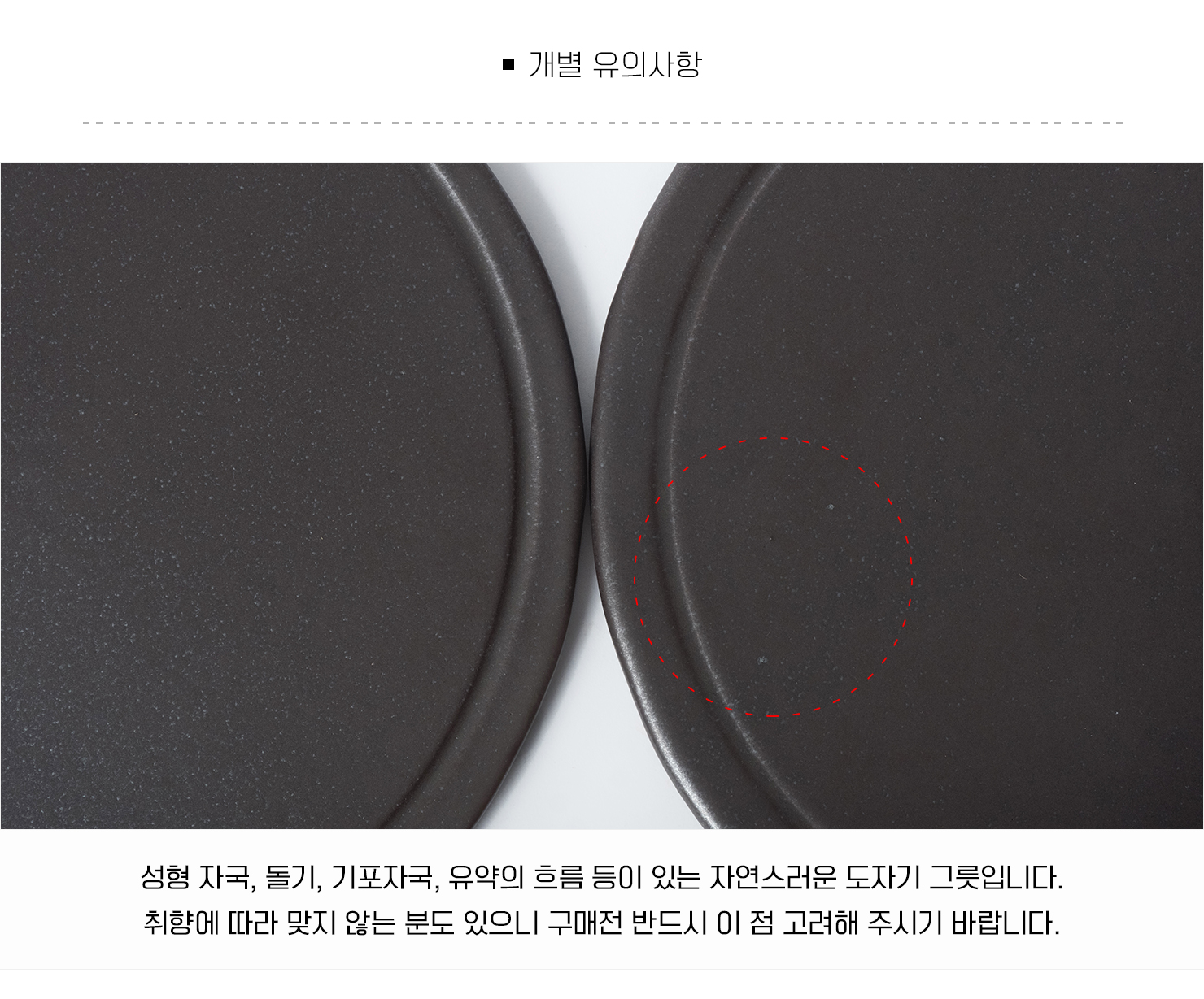 | 핸드메이드 도자기 그릇은 일반적인 공산품과 다릅니다. 가마의 분위기, 매번 달라지는 흙의 속성, 유약의 미세한 비율등 셀 수 없는 많은 요소로 인하여 끊임없이 요변이 일어나는 것이 핸드메이드 도자기 입니다. 상세 페이지와 다른 색상톤, 철분점과 돌기, 기포자국, 물레 형성자국, 가마에 닿는 바닥면의 흠집, 색배임 등등 핸드메이드 그릇 고유의 특징에 대하여 민감하신 분은 구매전 다시 한 번 고려하여 주시기 바랍니다. 온라인 쇼핑몰 특성상 사진이 본래의 제품과 100% 똑같이 나온다고 말씀드릴 순 없습니다. 항상 실제 제품과 같아 보이도록 최선을 다하고 있지만, 촬영 당시의 한 두개의 모델로 촬영된 제품과 꾸준히 생산되며 재입고되는 제품들은 요변에 따라 차이점이 날 수 밖에 없음을 이해해 주시기 바랍니다. 또한, 제품을 검색하는 모니터, 핸드폰의 종류에 따라서도 색상의 차이가 달라지니 이 점 참고하시기 바랍니다. |