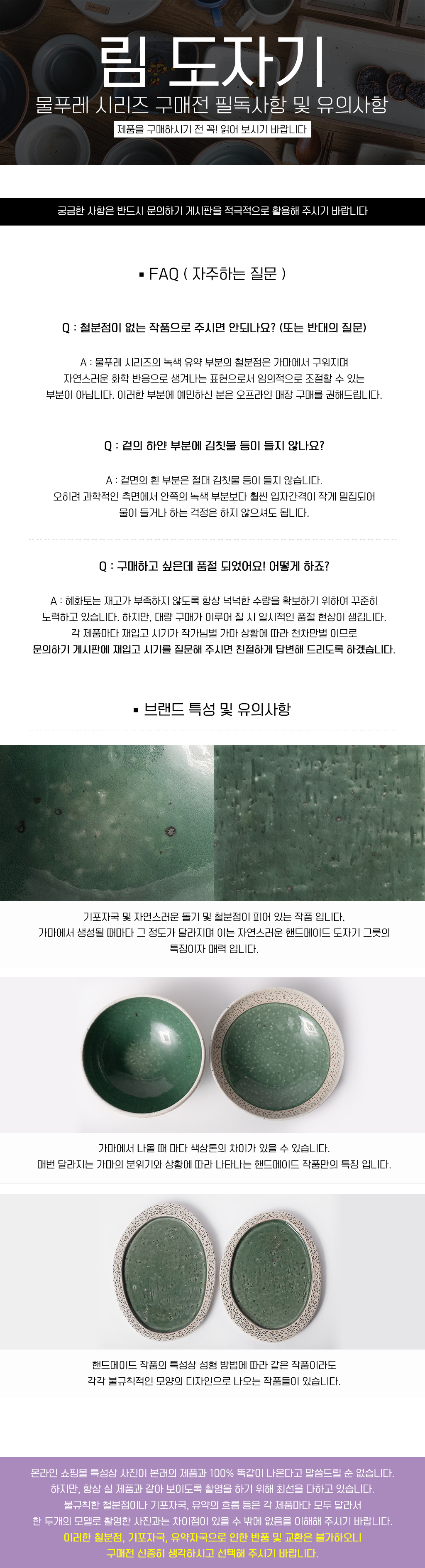 | 핸드메이드 도자기 그릇은 일반적인 공산품과 다릅니다. 가마의 분위기, 매번 달라지는 흙의 속성, 유약의 미세한 비율등 셀 수 없는 많은 요소로 인하여 끊임없이 요변이 일어나는 것이 핸드메이드 도자기 입니다. 상세 페이지와 다른 색상톤, 철분점과 돌기, 기포자국, 물레 형성자국, 가마에 닿는 바닥면의 흠집, 색배임 등등 핸드메이드 그릇 고유의 특징에 대하여 민감하신 분은 구매전 다시 한 번 고려하여 주시기 바랍니다. 온라인 쇼핑몰 특성상 사진이 본래의 제품과 100% 똑같이 나온다고 말씀드릴 순 없습니다. 항상 실제 제품과 같아 보이도록 최선을 다하고 있지만, 촬영 당시의 한 두개의 모델로 촬영된 제품과 꾸준히 생산되며 재입고되는 제품들은 요변에 따라 차이점이 날 수 밖에 없음을 이해해 주시기 바랍니다. 또한, 제품을 검색하는 모니터, 핸드폰의 종류에 따라서도 색상의 차이가 달라지니 이 점 참고하시기 바랍니다. |