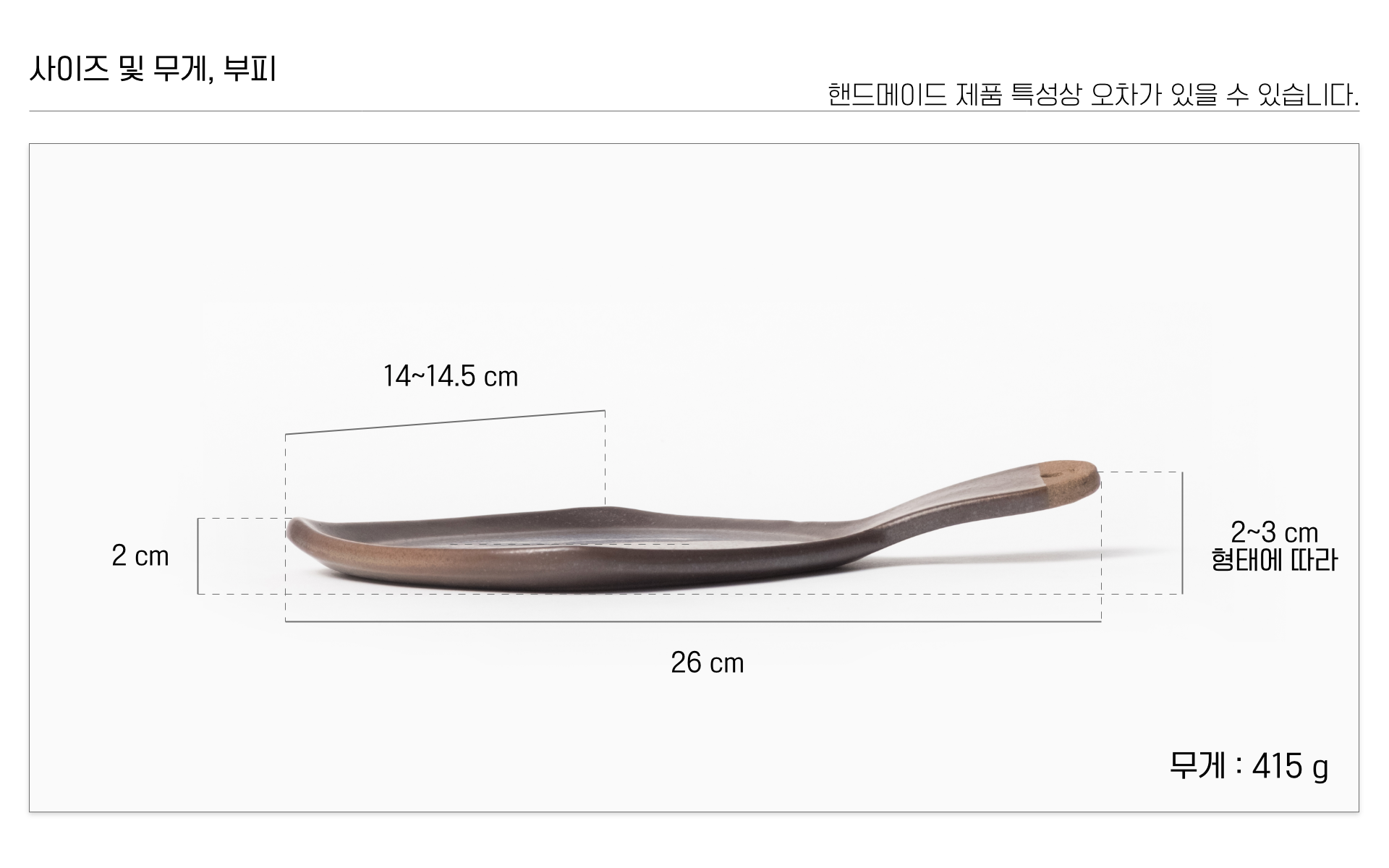 | 핸드메이드 도자기 그릇은 일반적인 공산품과 다릅니다. 가마의 분위기, 매번 달라지는 흙의 속성, 유약의 미세한 비율등 셀 수 없는 많은 요소로 인하여 끊임없이 요변이 일어나는 것이 핸드메이드 도자기 입니다. 상세 페이지와 다른 색상톤, 철분점과 돌기, 기포자국, 물레 형성자국, 가마에 닿는 바닥면의 흠집, 색배임 등등 핸드메이드 그릇 고유의 특징에 대하여 민감하신 분은 구매전 다시 한 번 고려하여 주시기 바랍니다. 온라인 쇼핑몰 특성상 사진이 본래의 제품과 100% 똑같이 나온다고 말씀드릴 순 없습니다. 항상 실제 제품과 같아 보이도록 최선을 다하고 있지만, 촬영 당시의 한 두개의 모델로 촬영된 제품과 꾸준히 생산되며 재입고되는 제품들은 요변에 따라 차이점이 날 수 밖에 없음을 이해해 주시기 바랍니다. 또한, 제품을 검색하는 모니터, 핸드폰의 종류에 따라서도 색상의 차이가 달라지니 이 점 참고하시기 바랍니다. |