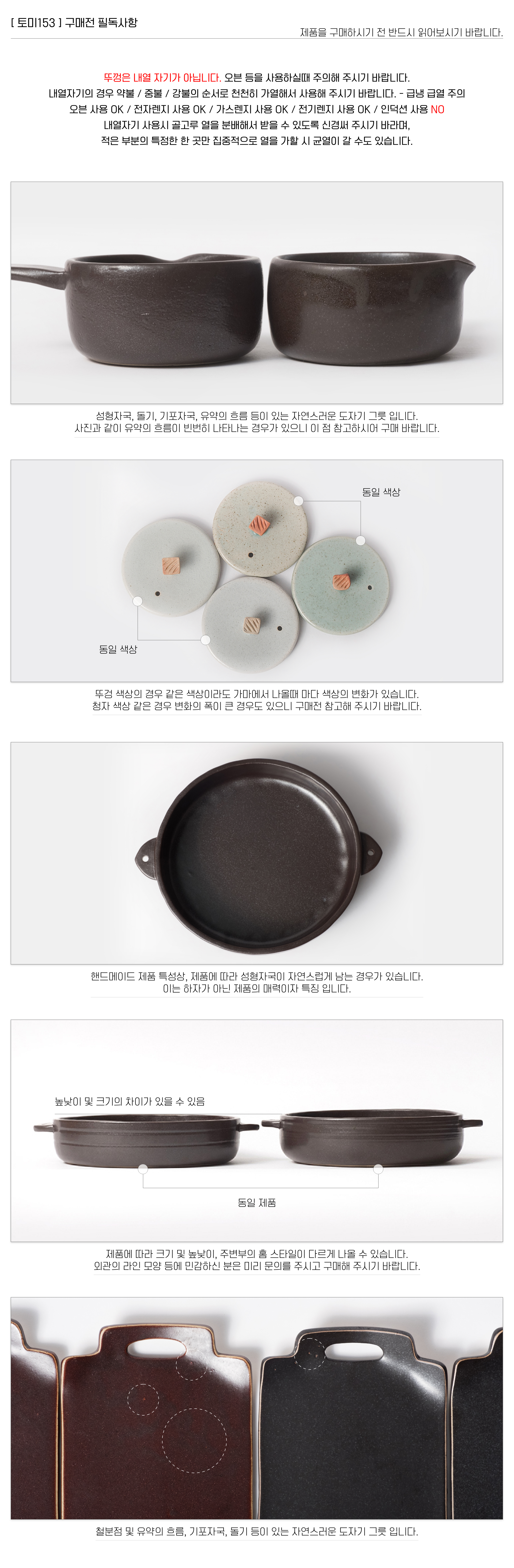 | 핸드메이드 도자기 그릇은 일반적인 공산품과 다릅니다. 가마의 분위기, 매번 달라지는 흙의 속성, 유약의 미세한 비율등 셀 수 없는 많은 요소로 인하여 끊임없이 요변이 일어나는 것이 핸드메이드 도자기 입니다. 상세 페이지와 다른 색상톤, 철분점과 돌기, 기포자국, 물레 형성자국, 가마에 닿는 바닥면의 흠집, 색배임 등등 핸드메이드 그릇 고유의 특징에 대하여 민감하신 분은 구매전 다시 한 번 고려하여 주시기 바랍니다. 온라인 쇼핑몰 특성상 사진이 본래의 제품과 100% 똑같이 나온다고 말씀드릴 순 없습니다. 항상 실제 제품과 같아 보이도록 최선을 다하고 있지만, 촬영 당시의 한 두개의 모델로 촬영된 제품과 꾸준히 생산되며 재입고되는 제품들은 요변에 따라 차이점이 날 수 밖에 없음을 이해해 주시기 바랍니다. 또한, 제품을 검색하는 모니터, 핸드폰의 종류에 따라서도 색상의 차이가 달라지니 이 점 참고하시기 바랍니다. |
