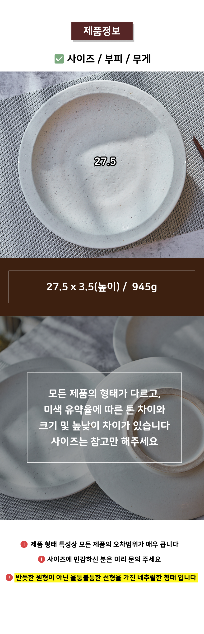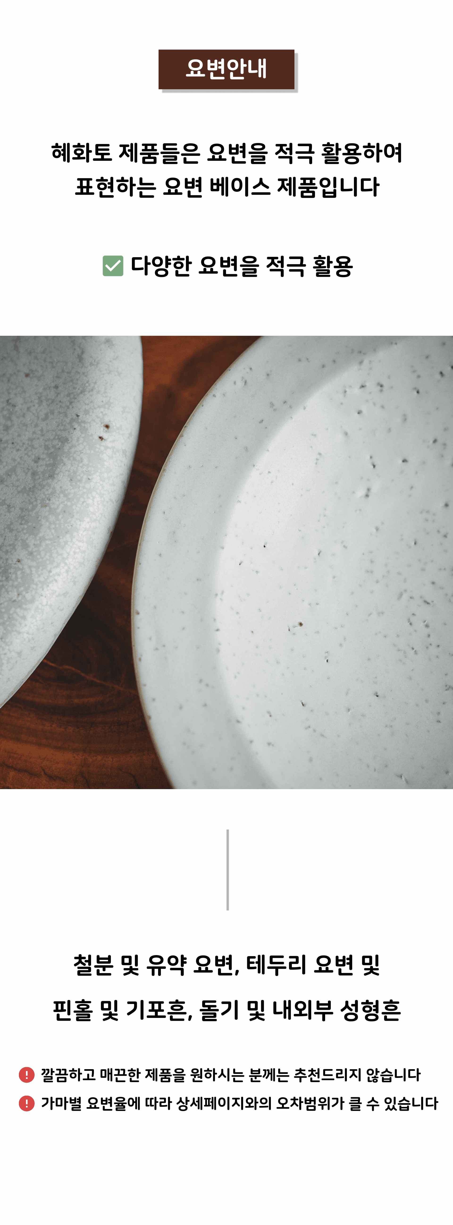 • 가마에서 나올때마다 차이가 있으니, 기계 공산품처럼 깔끔하고 딱 떨어지는 제품을 원하시는 분들께는 구매를 추천드리지 않습니다.