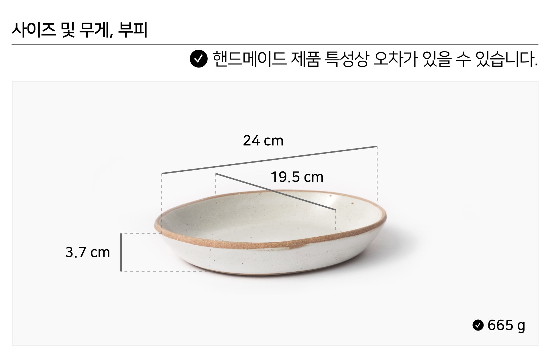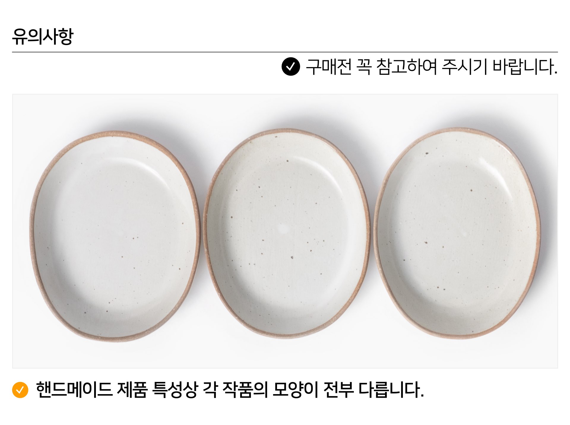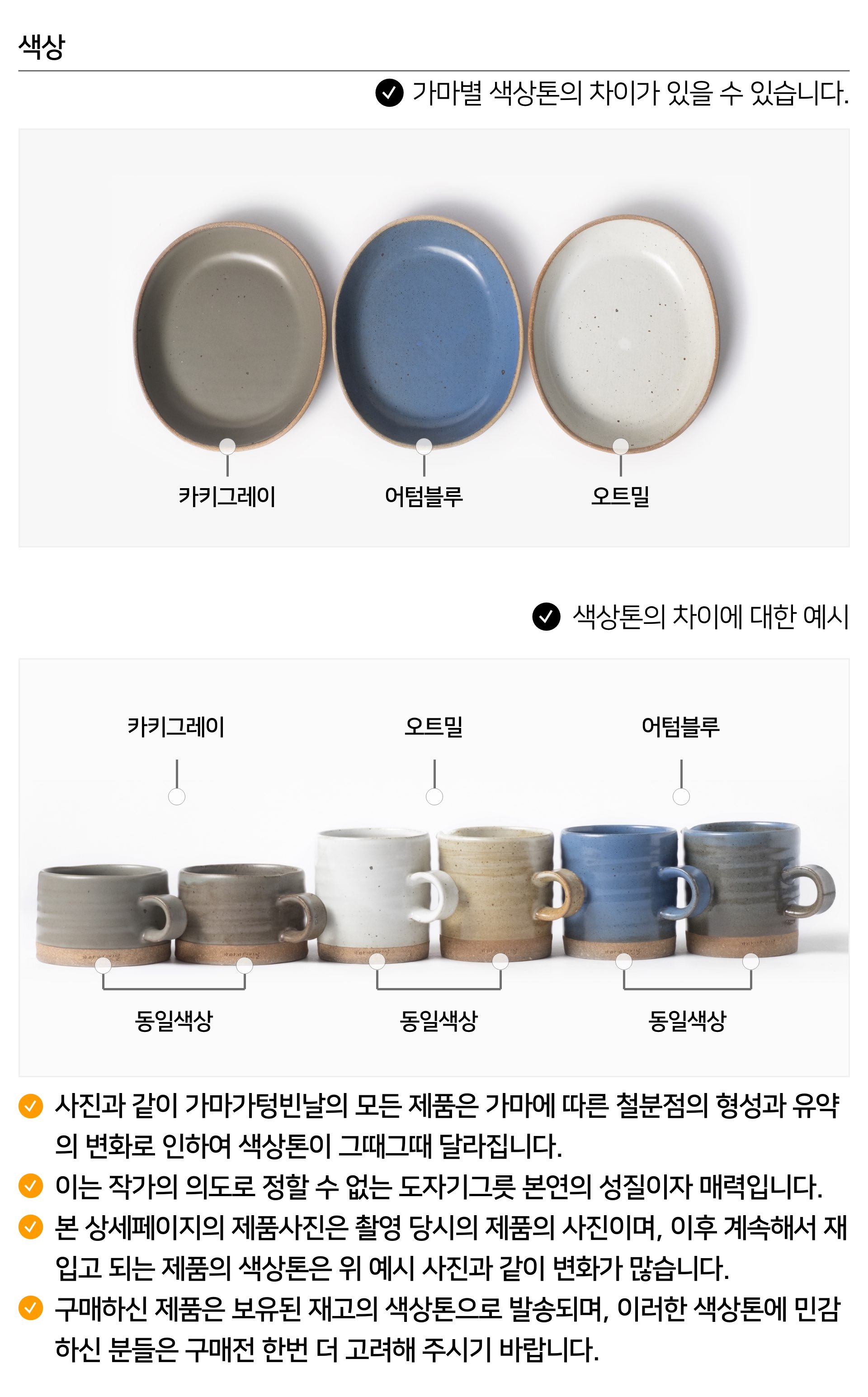 | 핸드메이드 도자기 그릇은 일반적인 공산품과 다릅니다. 가마의 분위기, 매번 달라지는 흙의 속성, 유약의 미세한 비율등 셀 수 없는 많은 요소로 인하여 끊임없이 요변이 일어나는 것이 핸드메이드 도자기 입니다. 상세 페이지와 다른 색상톤, 철분점과 돌기, 기포자국, 물레 형성자국, 가마에 닿는 바닥면의 흠집, 색배임 등등 핸드메이드 그릇 고유의 특징에 대하여 민감하신 분은 구매전 다시 한 번 고려하여 주시기 바랍니다. 온라인 쇼핑몰 특성상 사진이 본래의 제품과 100% 똑같이 나온다고 말씀드릴 순 없습니다. 항상 실제 제품과 같아 보이도록 최선을 다하고 있지만, 촬영 당시의 한 두개의 모델로 촬영된 제품과 꾸준히 생산되며 재입고되는 제품들은 요변에 따라 차이점이 날 수 밖에 없음을 이해해 주시기 바랍니다. 또한, 제품을 검색하는 모니터, 핸드폰의 종류에 따라서도 색상의 차이가 달라지니 이 점 참고하시기 바랍니다. |