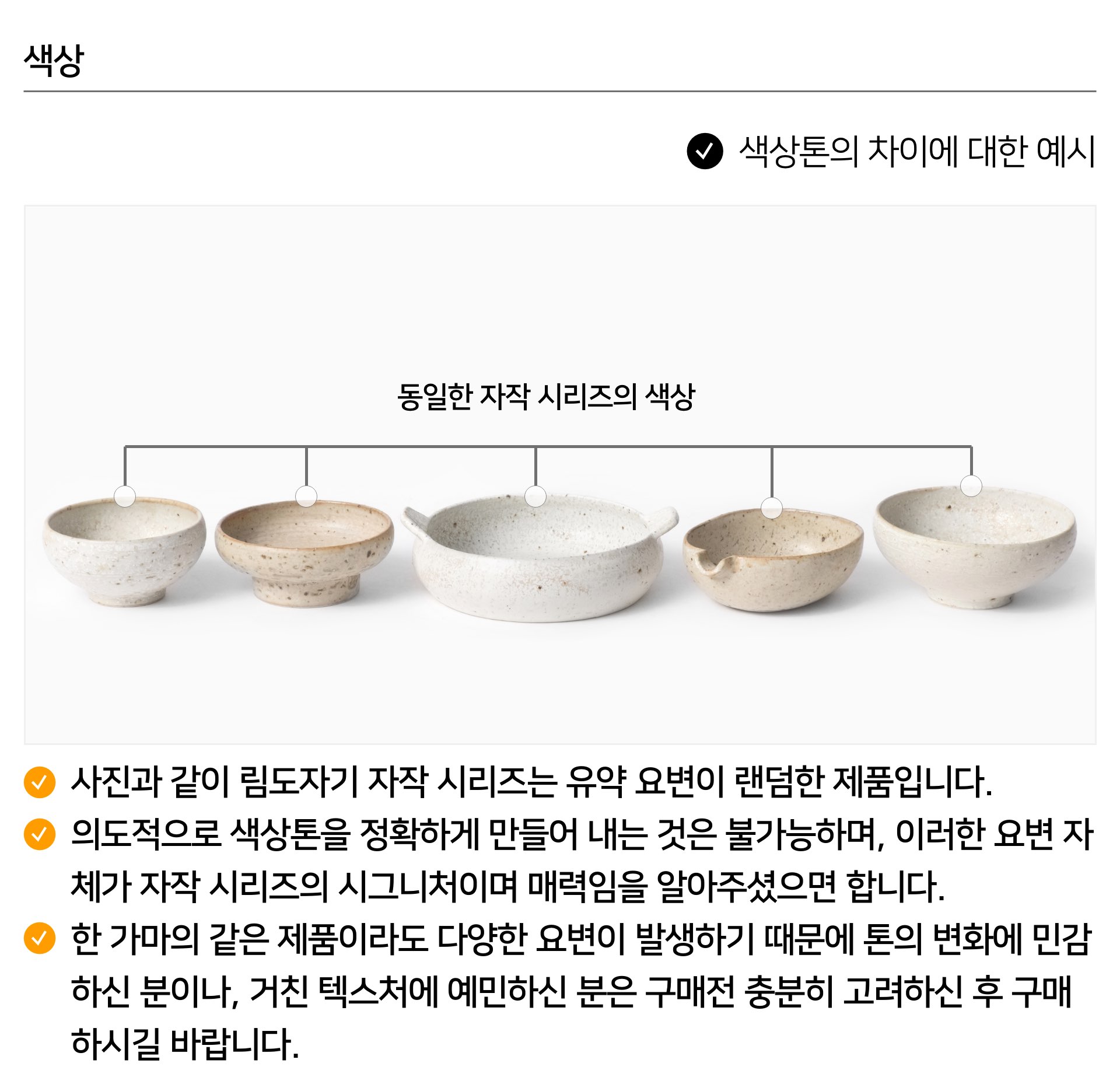 | 핸드메이드 도자기 그릇은 일반적인 공산품과 다릅니다. 가마의 분위기, 매번 달라지는 흙의 속성, 유약의 미세한 비율등 셀 수 없는 많은 요소로 인하여 끊임없이 요변이 일어나는 것이 핸드메이드 도자기 입니다. 상세 페이지와 다른 색상톤, 철분점과 돌기, 기포자국, 물레 형성자국, 가마에 닿는 바닥면의 흠집, 색배임 등등 핸드메이드 그릇 고유의 특징에 대하여 민감하신 분은 구매전 다시 한 번 고려하여 주시기 바랍니다. 온라인 쇼핑몰 특성상 사진이 본래의 제품과 100% 똑같이 나온다고 말씀드릴 순 없습니다. 항상 실제 제품과 같아 보이도록 최선을 다하고 있지만, 촬영 당시의 한 두개의 모델로 촬영된 제품과 꾸준히 생산되며 재입고되는 제품들은 요변에 따라 차이점이 날 수 밖에 없음을 이해해 주시기 바랍니다. 또한, 제품을 검색하는 모니터, 핸드폰의 종류에 따라서도 색상의 차이가 달라지니 이 점 참고하시기 바랍니다. |