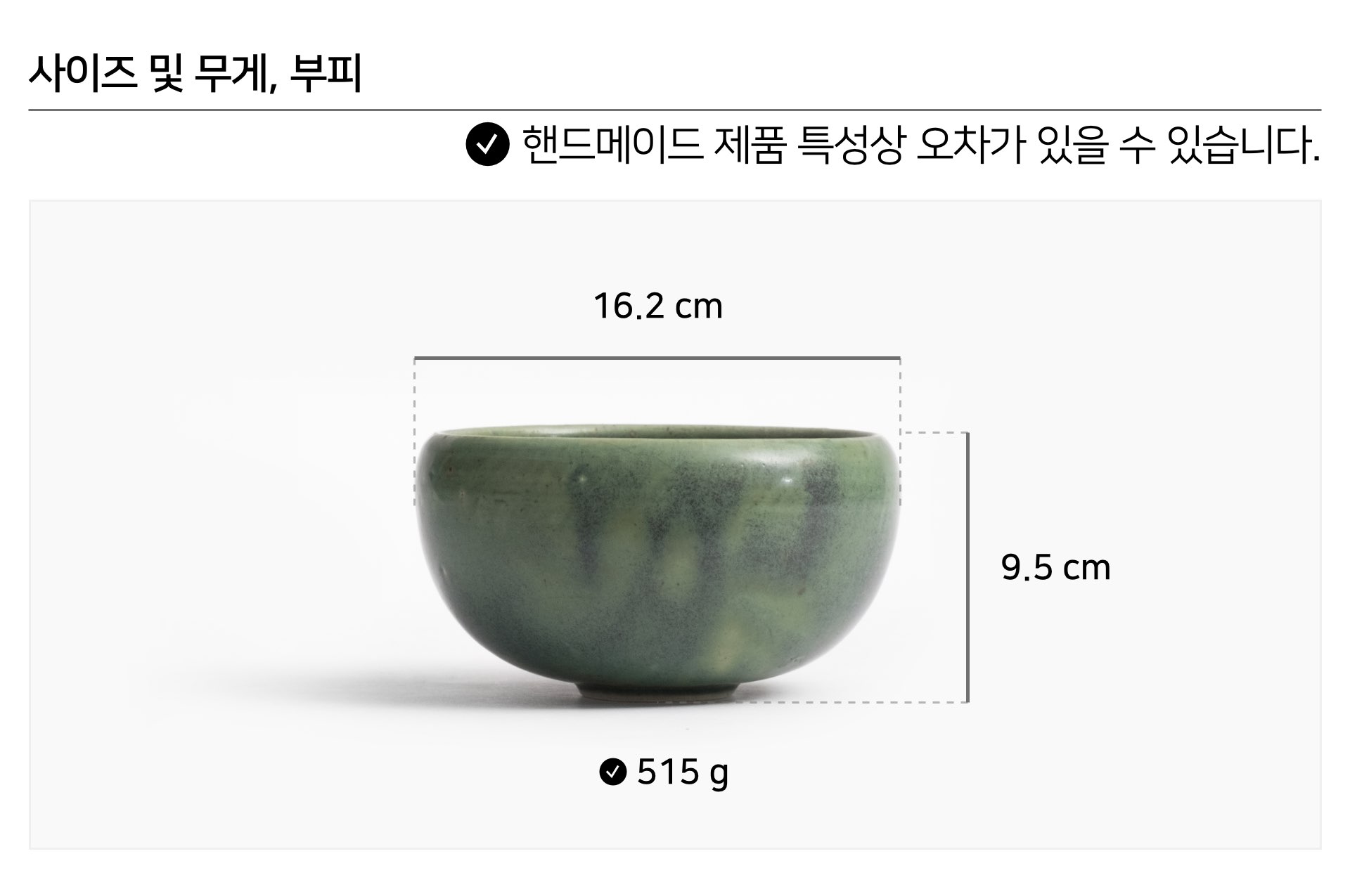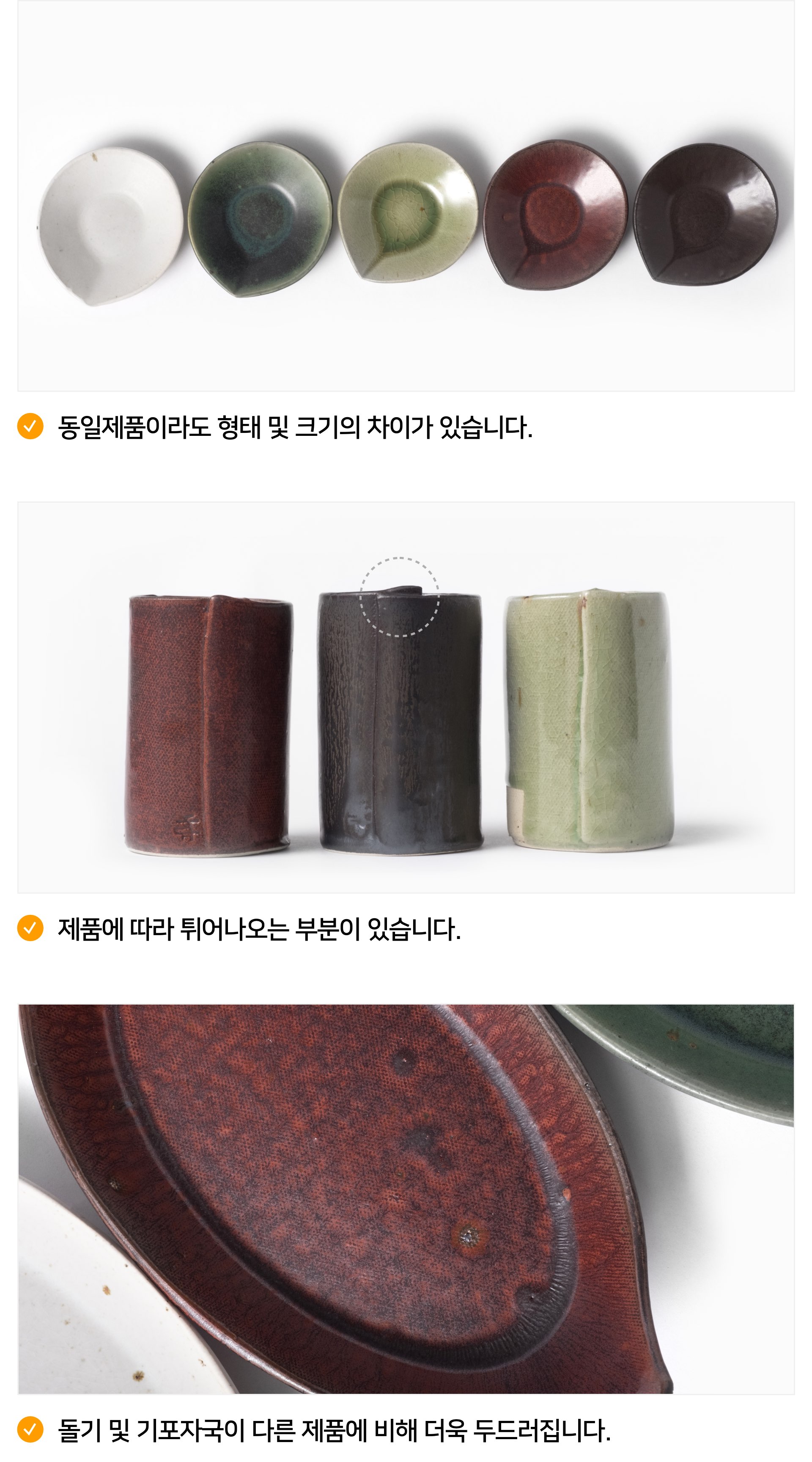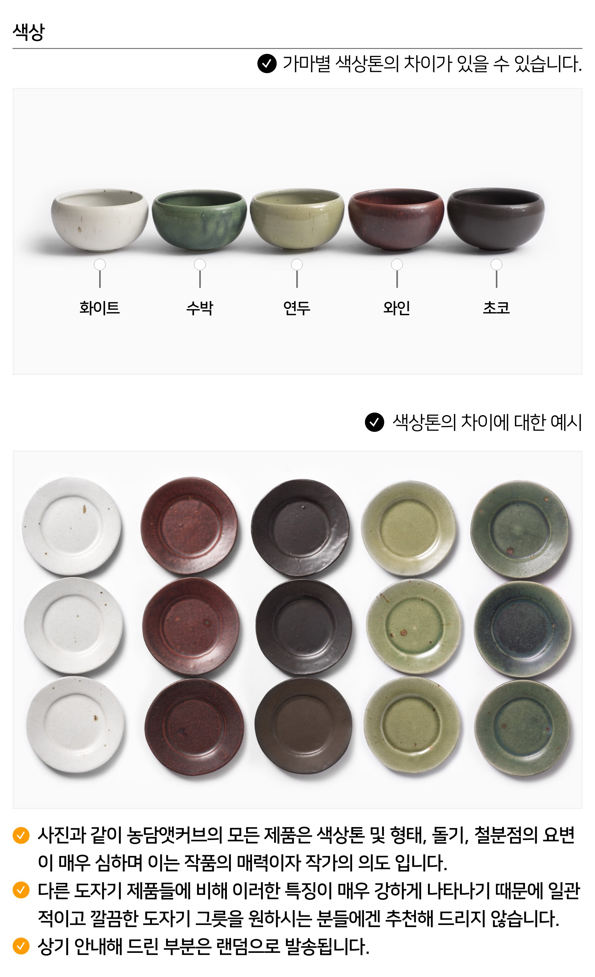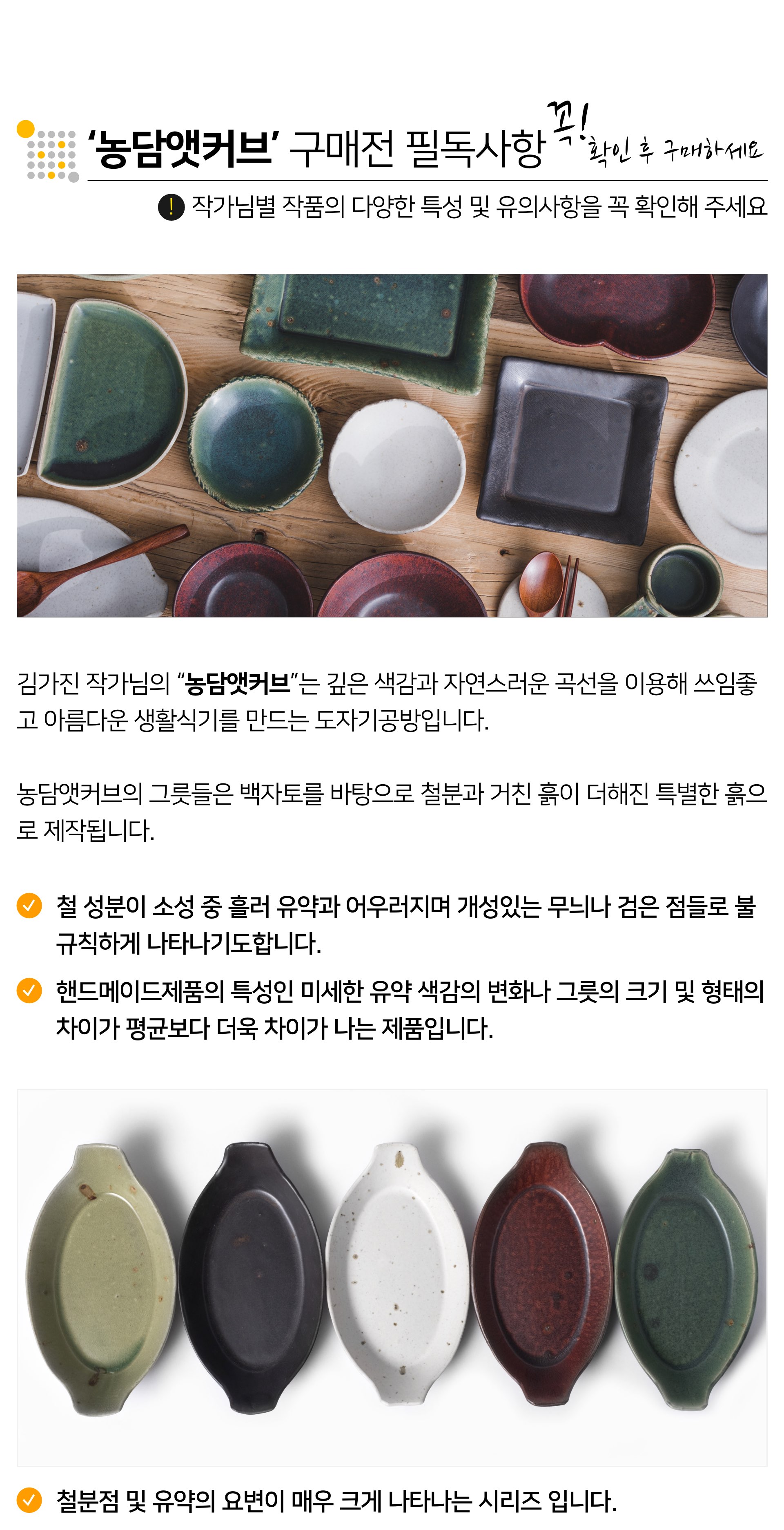 | 핸드메이드 도자기 그릇은 일반적인 공산품과 다릅니다. 가마의 분위기, 매번 달라지는 흙의 속성, 유약의 미세한 비율등 셀 수 없는 많은 요소로 인하여 끊임없이 요변이 일어나는 것이 핸드메이드 도자기 입니다. 상세 페이지와 다른 색상톤, 철분점과 돌기, 기포자국, 물레 형성자국, 가마에 닿는 바닥면의 흠집, 색배임 등등 핸드메이드 그릇 고유의 특징에 대하여 민감하신 분은 구매전 다시 한 번 고려하여 주시기 바랍니다. 온라인 쇼핑몰 특성상 사진이 본래의 제품과 100% 똑같이 나온다고 말씀드릴 순 없습니다. 항상 실제 제품과 같아 보이도록 최선을 다하고 있지만, 촬영 당시의 한 두개의 모델로 촬영된 제품과 꾸준히 생산되며 재입고되는 제품들은 요변에 따라 차이점이 날 수 밖에 없음을 이해해 주시기 바랍니다. 또한, 제품을 검색하는 모니터, 핸드폰의 종류에 따라서도 색상의 차이가 달라지니 이 점 참고하시기 바랍니다. |