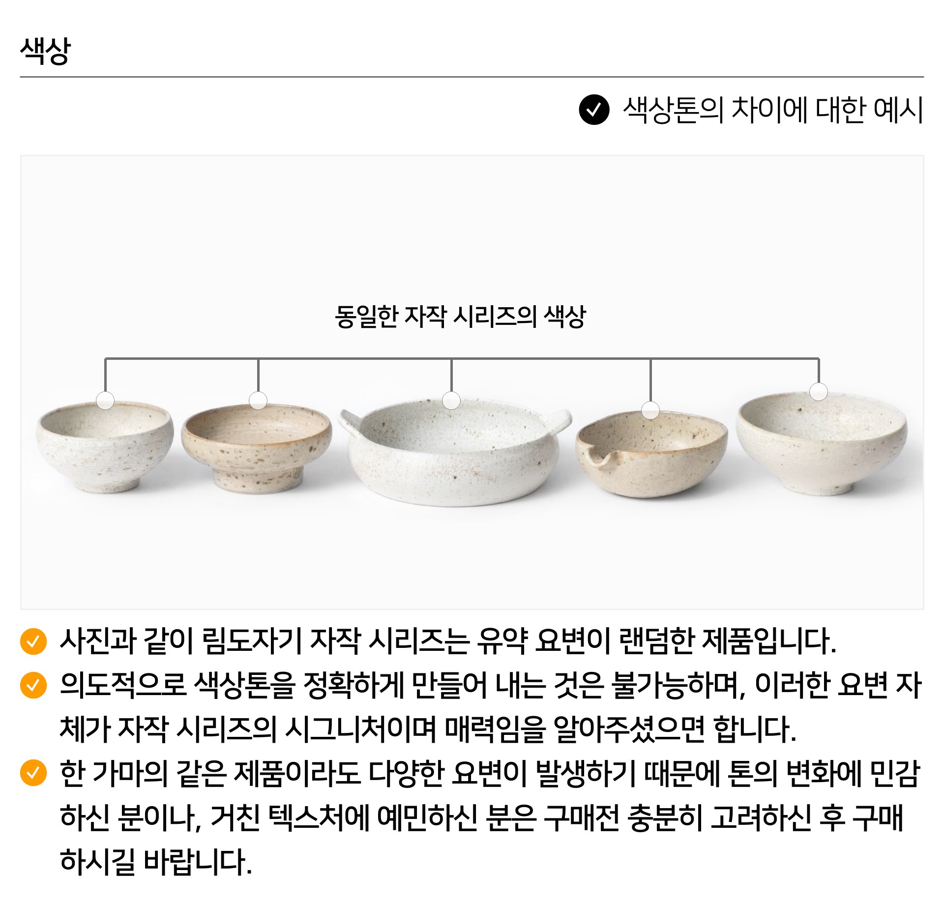 2022년 후반기 이천도자기 흙 교체로 인하여, 자작 시리즈의 색배임 현상이 이전보다 조금 더 있을 수 있습니다. 보통 세척 후 건조시 배인 색이 어느정도 날아가지만, 도자기 고유의 색배임 현상에 대하여 민감하신 분은 구매를 추천드리지 않습니다. 이러한 현상으로 인한 제품 교환 및 환불은 불가합니다.