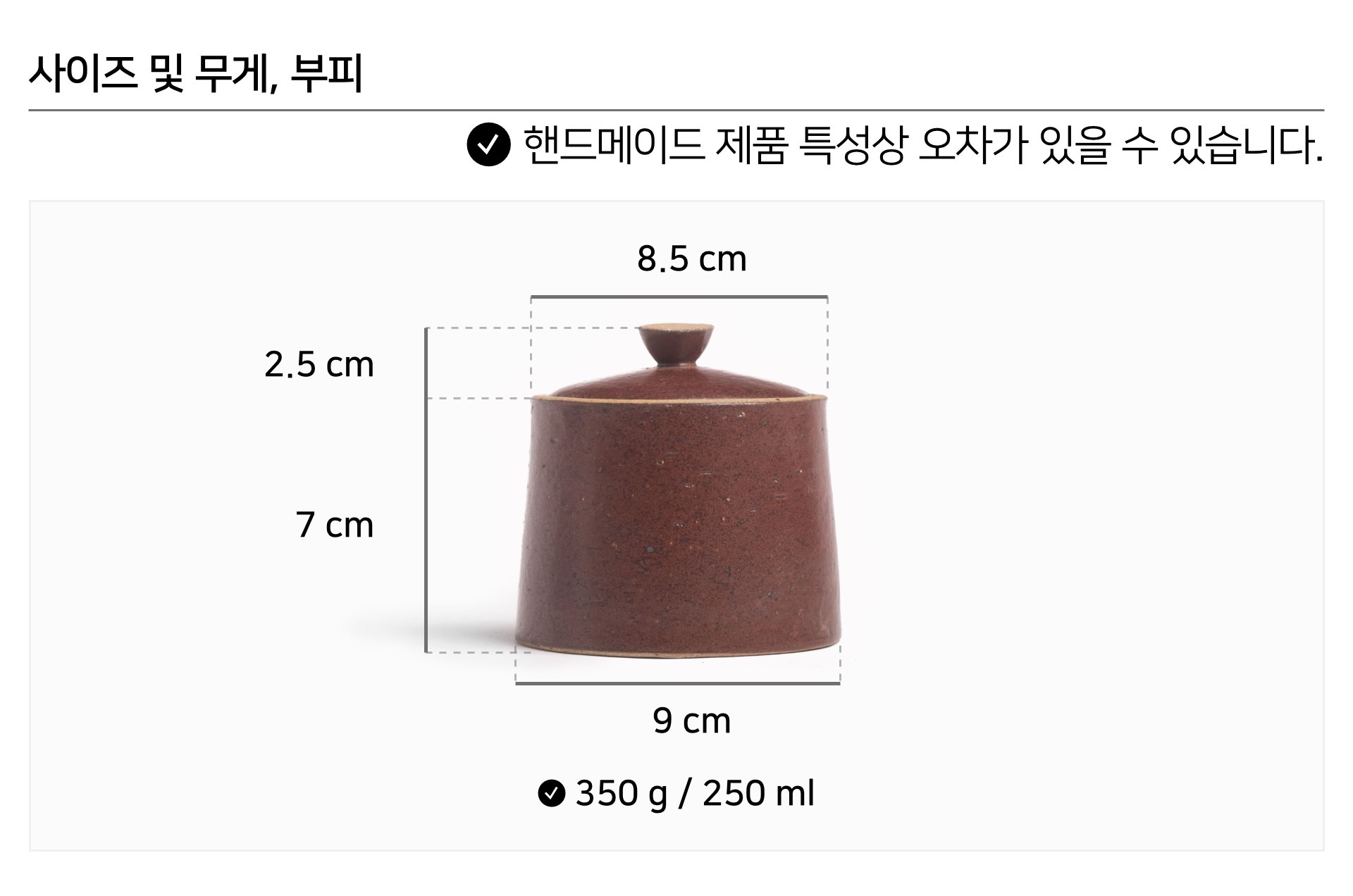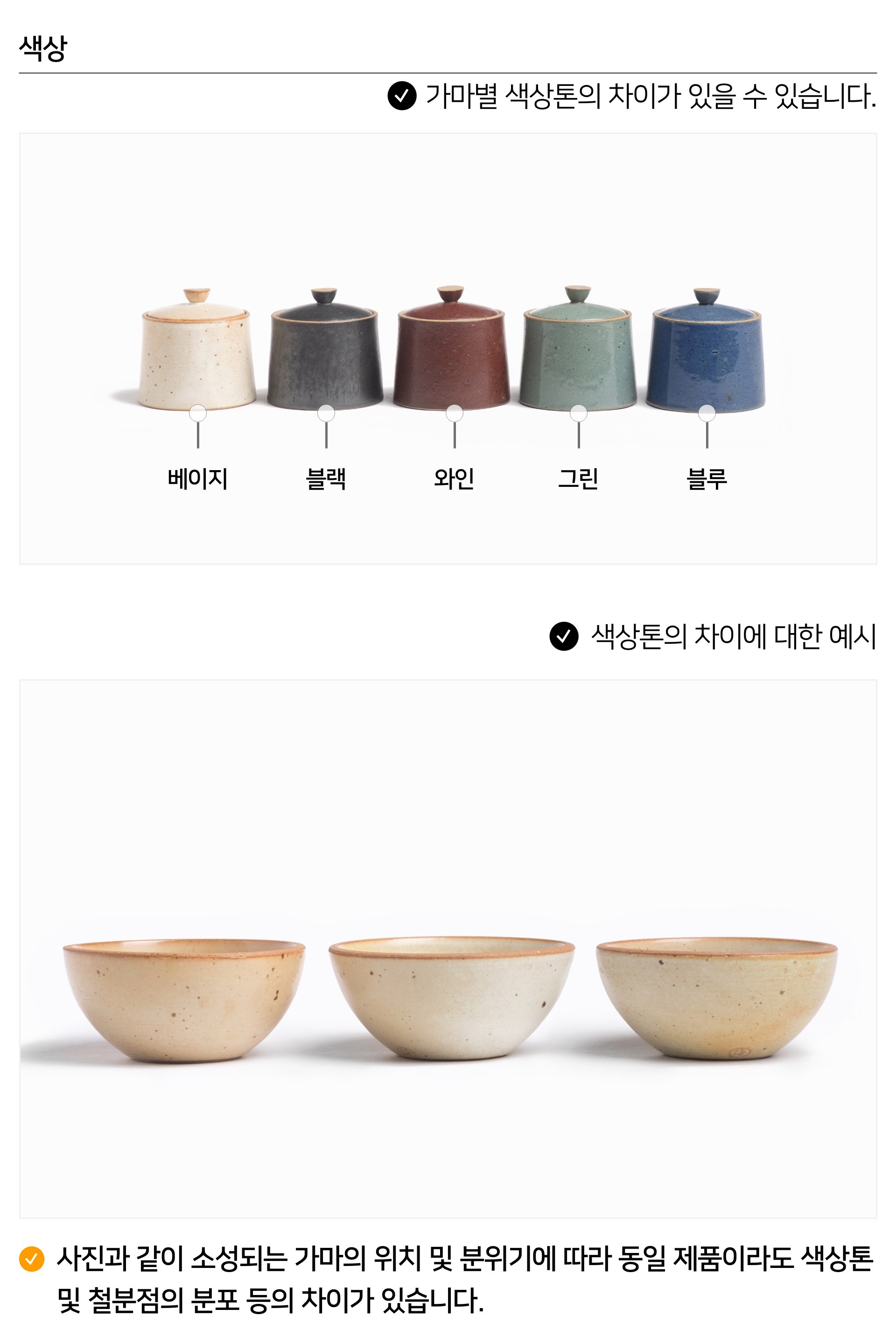 | 핸드메이드 도자기 그릇은 일반적인 공산품과 다릅니다. 가마의 분위기, 매번 달라지는 흙의 속성, 유약의 미세한 비율등 셀 수 없는 많은 요소로 인하여 끊임없이 요변이 일어나는 것이 핸드메이드 도자기 입니다. 상세 페이지와 다른 색상톤, 철분점과 돌기, 기포자국, 물레 형성자국, 가마에 닿는 바닥면의 흠집, 색배임 등등 핸드메이드 그릇 고유의 특징에 대하여 민감하신 분은 구매전 다시 한 번 고려하여 주시기 바랍니다. 온라인 쇼핑몰 특성상 사진이 본래의 제품과 100% 똑같이 나온다고 말씀드릴 순 없습니다. 항상 실제 제품과 같아 보이도록 최선을 다하고 있지만, 촬영 당시의 한 두개의 모델로 촬영된 제품과 꾸준히 생산되며 재입고되는 제품들은 요변에 따라 차이점이 날 수 밖에 없음을 이해해 주시기 바랍니다. 또한, 제품을 검색하는 모니터, 핸드폰의 종류에 따라서도 색상의 차이가 달라지니 이 점 참고하시기 바랍니다. |