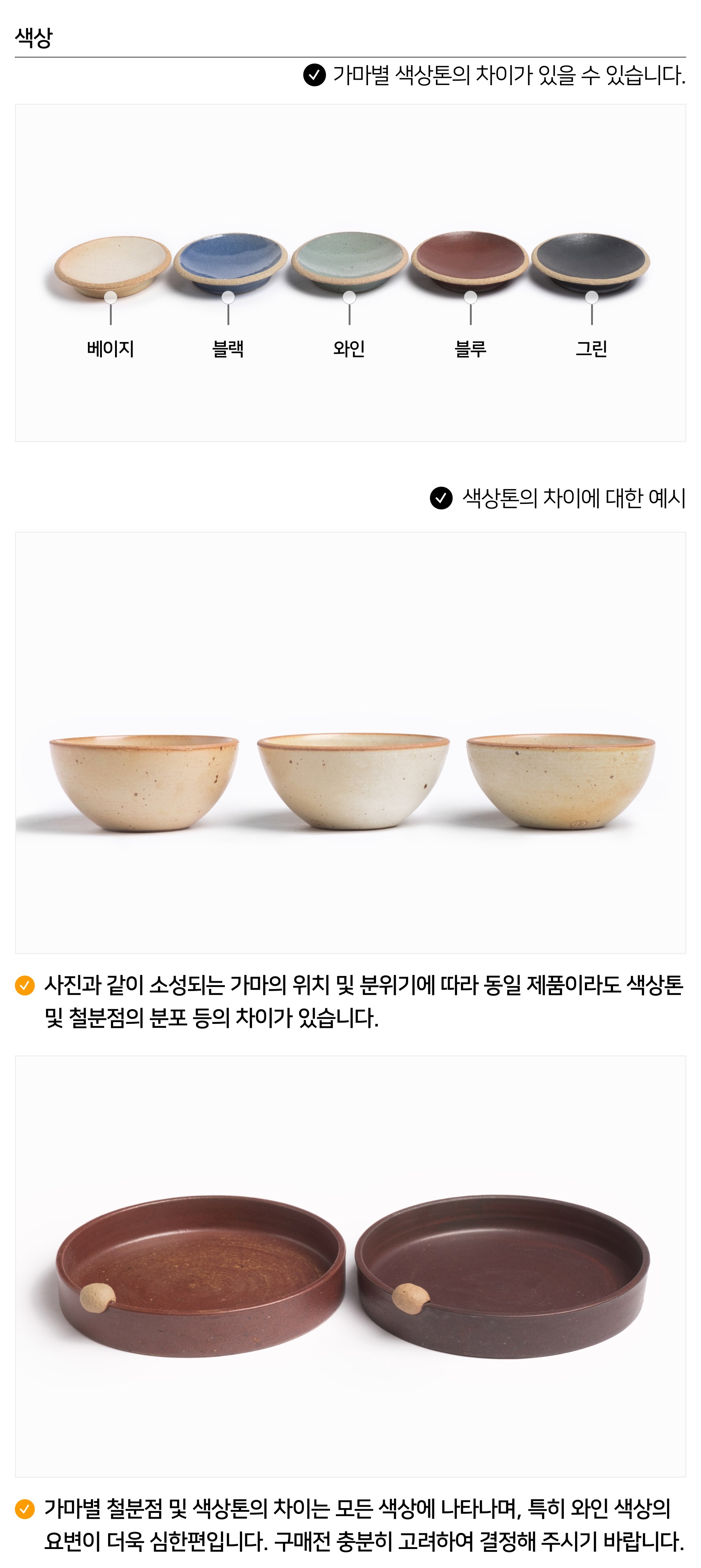 | 핸드메이드 도자기 그릇은 일반적인 공산품과 다릅니다. 가마의 분위기, 매번 달라지는 흙의 속성, 유약의 미세한 비율등 셀 수 없는 많은 요소로 인하여 끊임없이 요변이 일어나는 것이 핸드메이드 도자기 입니다. 상세 페이지와 다른 색상톤, 철분점과 돌기, 기포자국, 물레 형성자국, 가마에 닿는 바닥면의 흠집, 색배임 등등 핸드메이드 그릇 고유의 특징에 대하여 민감하신 분은 구매전 다시 한 번 고려하여 주시기 바랍니다. 온라인 쇼핑몰 특성상 사진이 본래의 제품과 100% 똑같이 나온다고 말씀드릴 순 없습니다. 항상 실제 제품과 같아 보이도록 최선을 다하고 있지만, 촬영 당시의 한 두개의 모델로 촬영된 제품과 꾸준히 생산되며 재입고되는 제품들은 요변에 따라 차이점이 날 수 밖에 없음을 이해해 주시기 바랍니다. 또한, 제품을 검색하는 모니터, 핸드폰의 종류에 따라서도 색상의 차이가 달라지니 이 점 참고하시기 바랍니다. |