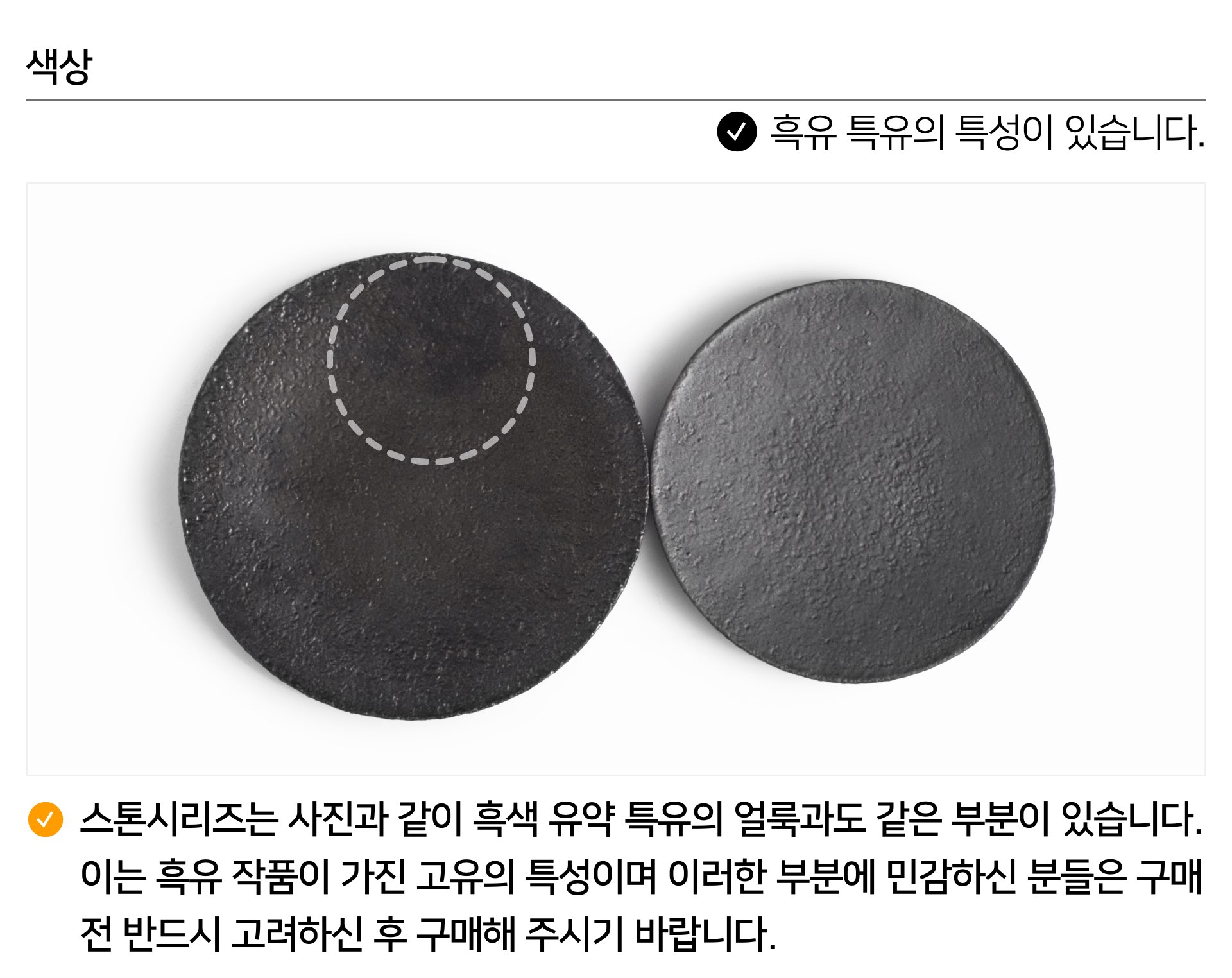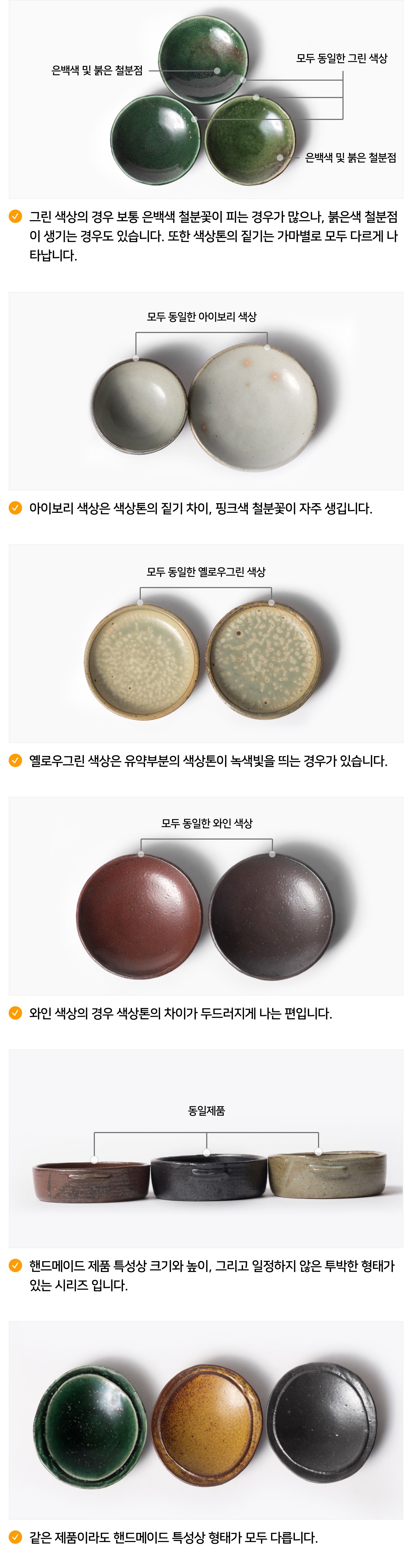 | 핸드메이드 도자기 그릇은 일반적인 공산품과 다릅니다. 가마의 분위기, 매번 달라지는 흙의 속성, 유약의 미세한 비율등 셀 수 없는 많은 요소로 인하여 끊임없이 요변이 일어나는 것이 핸드메이드 도자기 입니다. 상세 페이지와 다른 색상톤, 철분점과 돌기, 기포자국, 물레 형성자국, 가마에 닿는 바닥면의 흠집, 색배임 등등 핸드메이드 그릇 고유의 특징에 대하여 민감하신 분은 구매전 다시 한 번 고려하여 주시기 바랍니다. 온라인 쇼핑몰 특성상 사진이 본래의 제품과 100% 똑같이 나온다고 말씀드릴 순 없습니다. 항상 실제 제품과 같아 보이도록 최선을 다하고 있지만, 촬영 당시의 한 두개의 모델로 촬영된 제품과 꾸준히 생산되며 재입고되는 제품들은 요변에 따라 차이점이 날 수 밖에 없음을 이해해 주시기 바랍니다. 또한, 제품을 검색하는 모니터, 핸드폰의 종류에 따라서도 색상의 차이가 달라지니 이 점 참고하시기 바랍니다. |