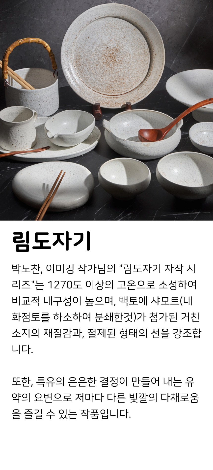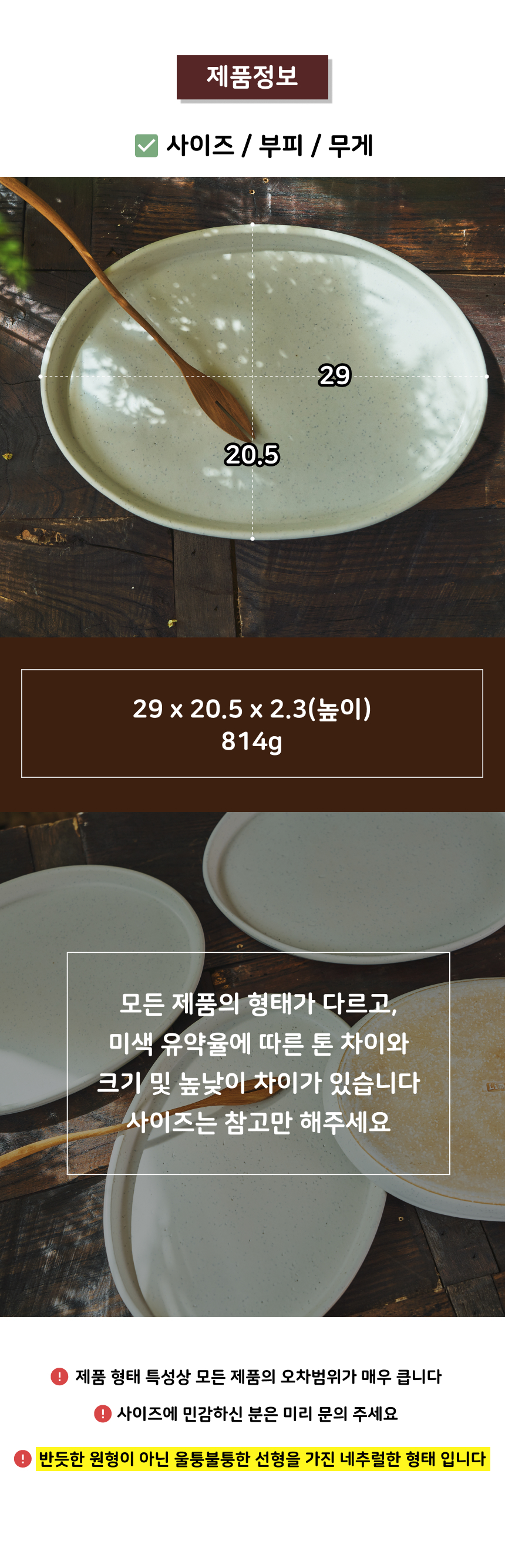| 핸드메이드 도자기 그릇은 일반적인 공산품과 다릅니다. 가마의 분위기, 매번 달라지는 흙의 속성, 유약의 미세한 비율등 셀 수 없는 많은 요소로 인하여 끊임없이 요변이 일어나는 것이 핸드메이드 도자기 입니다. 상세 페이지와 다른 색상톤, 철분점과 돌기, 기포자국, 물레 형성자국, 가마에 닿는 바닥면의 흠집, 색배임 등등 핸드메이드 그릇 고유의 특징에 대하여 민감하신 분은 구매전 다시 한 번 고려하여 주시기 바랍니다. 온라인 쇼핑몰 특성상 사진이 본래의 제품과 100% 똑같이 나온다고 말씀드릴 순 없습니다. 항상 실제 제품과 같아 보이도록 최선을 다하고 있지만, 촬영 당시의 한 두개의 모델로 촬영된 제품과 꾸준히 생산되며 재입고되는 제품들은 요변에 따라 차이점이 날 수 밖에 없음을 이해해 주시기 바랍니다. 또한, 제품을 검색하는 모니터, 핸드폰의 종류에 따라서도 색상의 차이가 달라지니 이 점 참고하시기 바랍니다. |