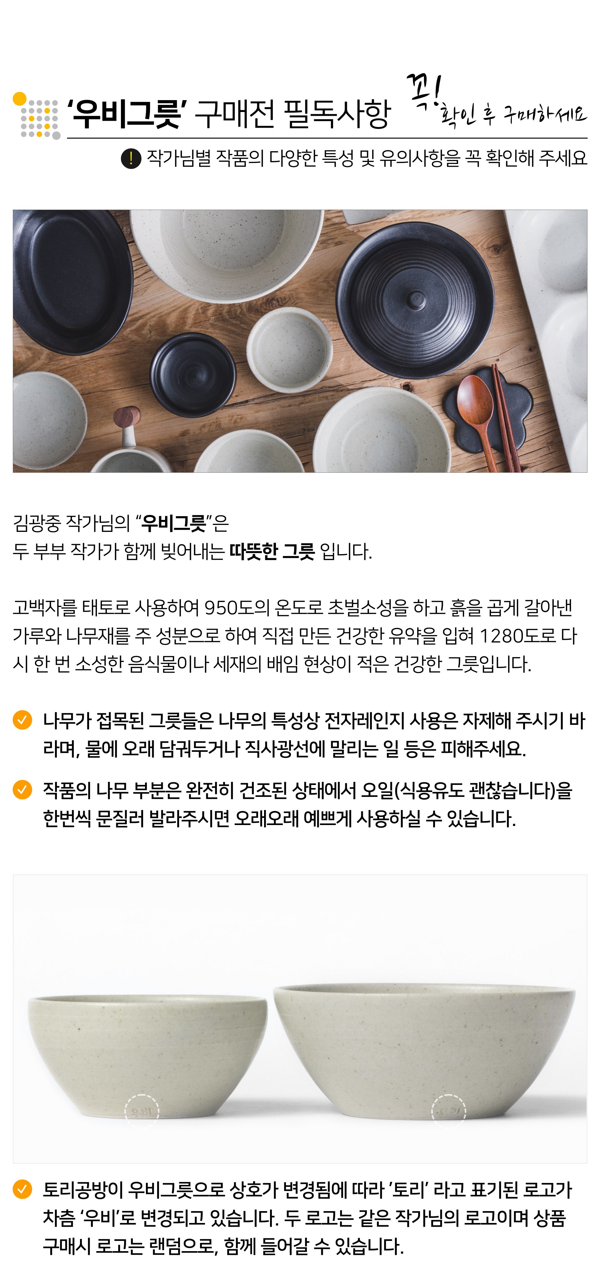 | 핸드메이드 도자기 그릇은 일반적인 공산품과 다릅니다. 가마의 분위기, 매번 달라지는 흙의 속성, 유약의 미세한 비율등 셀 수 없는 많은 요소로 인하여 끊임없이 요변이 일어나는 것이 핸드메이드 도자기 입니다. 상세 페이지와 다른 색상톤, 철분점과 돌기, 기포자국, 물레 형성자국, 가마에 닿는 바닥면의 흠집, 색배임 등등 핸드메이드 그릇 고유의 특징에 대하여 민감하신 분은 구매전 다시 한 번 고려하여 주시기 바랍니다. 온라인 쇼핑몰 특성상 사진이 본래의 제품과 100% 똑같이 나온다고 말씀드릴 순 없습니다. 항상 실제 제품과 같아 보이도록 최선을 다하고 있지만, 촬영 당시의 한 두개의 모델로 촬영된 제품과 꾸준히 생산되며 재입고되는 제품들은 요변에 따라 차이점이 날 수 밖에 없음을 이해해 주시기 바랍니다. 또한, 제품을 검색하는 모니터, 핸드폰의 종류에 따라서도 색상의 차이가 달라지니 이 점 참고하시기 바랍니다. |