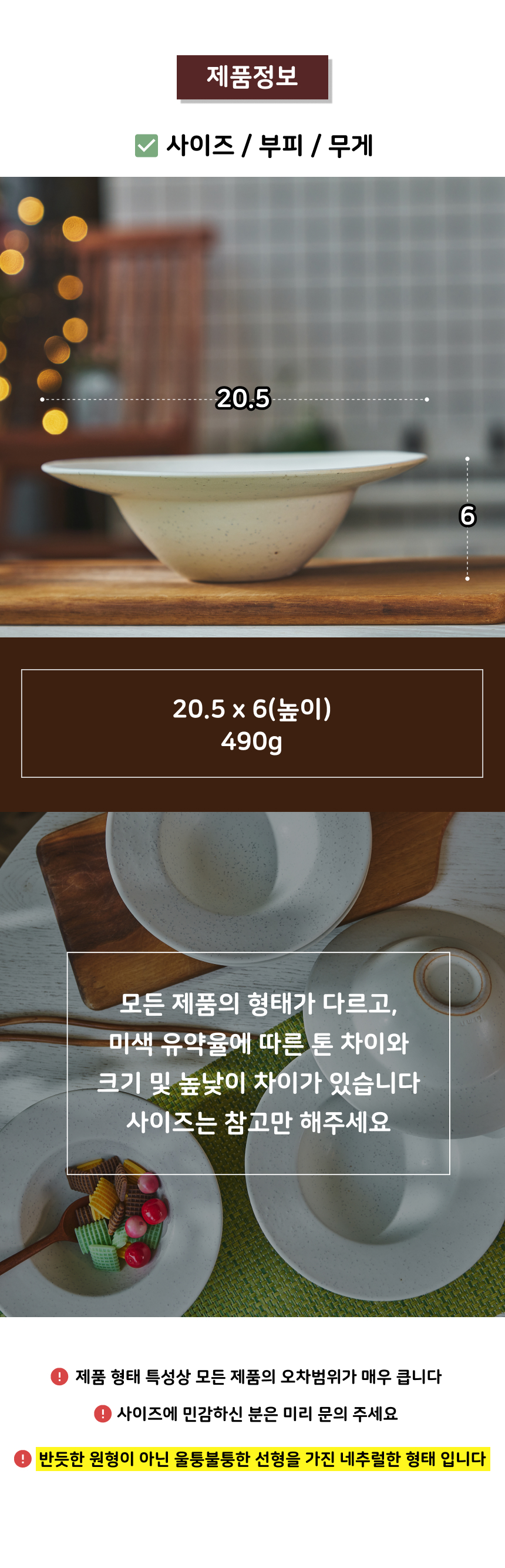 | 핸드메이드 도자기 그릇은 일반적인 공산품과 다릅니다. 가마의 분위기, 매번 달라지는 흙의 속성, 유약의 미세한 비율등 셀 수 없는 많은 요소로 인하여 끊임없이 요변이 일어나는 것이 핸드메이드 도자기 입니다. 상세 페이지와 다른 색상톤, 철분점과 돌기, 기포자국, 물레 형성자국, 가마에 닿는 바닥면의 흠집, 색배임 등등 핸드메이드 그릇 고유의 특징에 대하여 민감하신 분은 구매전 다시 한 번 고려하여 주시기 바랍니다. 온라인 쇼핑몰 특성상 사진이 본래의 제품과 100% 똑같이 나온다고 말씀드릴 순 없습니다. 항상 실제 제품과 같아 보이도록 최선을 다하고 있지만, 촬영 당시의 한 두개의 모델로 촬영된 제품과 꾸준히 생산되며 재입고되는 제품들은 요변에 따라 차이점이 날 수 밖에 없음을 이해해 주시기 바랍니다. 또한, 제품을 검색하는 모니터, 핸드폰의 종류에 따라서도 색상의 차이가 달라지니 이 점 참고하시기 바랍니다. |