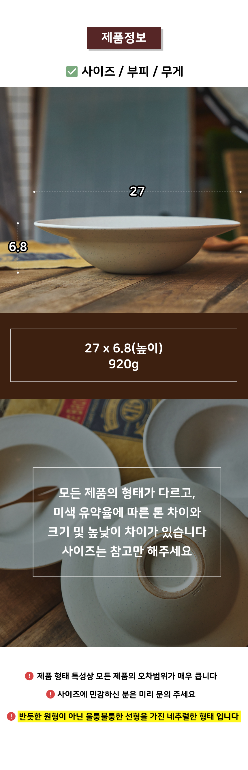 | 핸드메이드 도자기 그릇은 일반적인 공산품과 다릅니다. 가마의 분위기, 매번 달라지는 흙의 속성, 유약의 미세한 비율등 셀 수 없는 많은 요소로 인하여 끊임없이 요변이 일어나는 것이 핸드메이드 도자기 입니다. 상세 페이지와 다른 색상톤, 철분점과 돌기, 기포자국, 물레 형성자국, 가마에 닿는 바닥면의 흠집, 색배임 등등 핸드메이드 그릇 고유의 특징에 대하여 민감하신 분은 구매전 다시 한 번 고려하여 주시기 바랍니다. 온라인 쇼핑몰 특성상 사진이 본래의 제품과 100% 똑같이 나온다고 말씀드릴 순 없습니다. 항상 실제 제품과 같아 보이도록 최선을 다하고 있지만, 촬영 당시의 한 두개의 모델로 촬영된 제품과 꾸준히 생산되며 재입고되는 제품들은 요변에 따라 차이점이 날 수 밖에 없음을 이해해 주시기 바랍니다. 또한, 제품을 검색하는 모니터, 핸드폰의 종류에 따라서도 색상의 차이가 달라지니 이 점 참고하시기 바랍니다. |