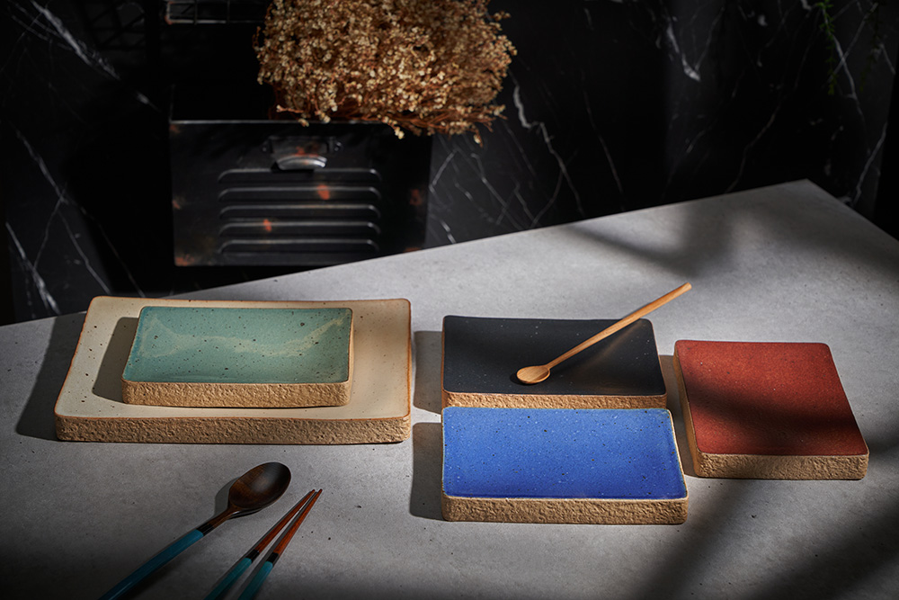 한미정 작가 ( 토판 ) ' 돌세팅 직사각 접시 '옆면 돌과 같은 재질 포인트 테두리 심플한 직사각 형태의 굽접시