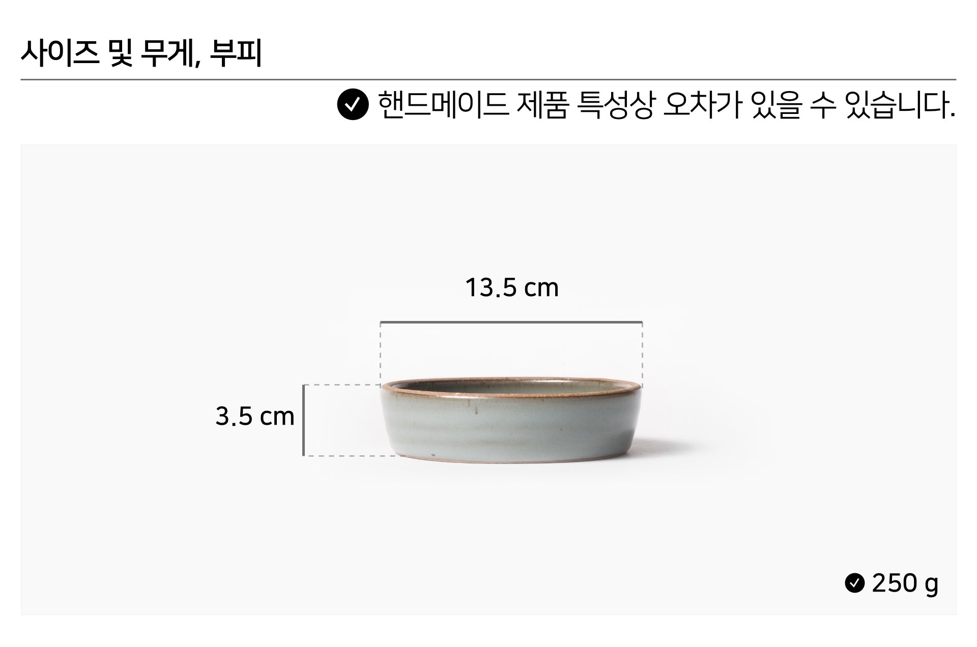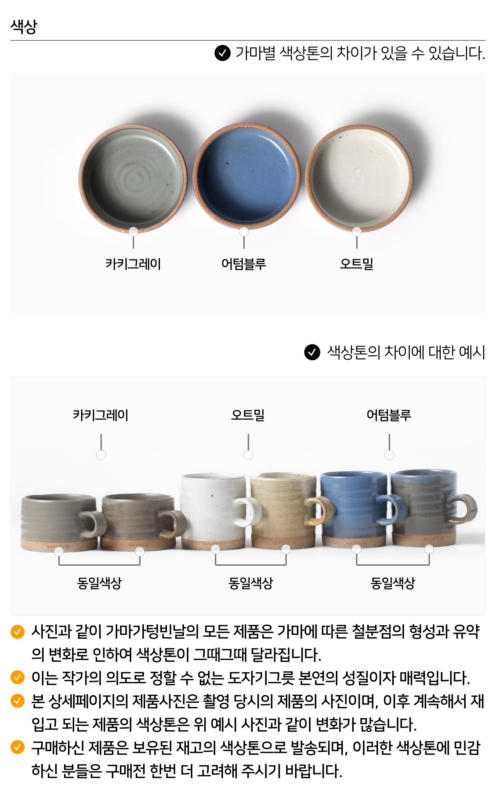 | 핸드메이드 도자기 그릇은 일반적인 공산품과 다릅니다. 가마의 분위기, 매번 달라지는 흙의 속성, 유약의 미세한 비율등 셀 수 없는 많은 요소로 인하여 끊임없이 요변이 일어나는 것이 핸드메이드 도자기 입니다. 상세 페이지와 다른 색상톤, 철분점과 돌기, 기포자국, 물레 형성자국, 가마에 닿는 바닥면의 흠집, 색배임 등등 핸드메이드 그릇 고유의 특징에 대하여 민감하신 분은 구매전 다시 한 번 고려하여 주시기 바랍니다. 온라인 쇼핑몰 특성상 사진이 본래의 제품과 100% 똑같이 나온다고 말씀드릴 순 없습니다. 항상 실제 제품과 같아 보이도록 최선을 다하고 있지만, 촬영 당시의 한 두개의 모델로 촬영된 제품과 꾸준히 생산되며 재입고되는 제품들은 요변에 따라 차이점이 날 수 밖에 없음을 이해해 주시기 바랍니다. 또한, 제품을 검색하는 모니터, 핸드폰의 종류에 따라서도 색상의 차이가 달라지니 이 점 참고하시기 바랍니다. |
