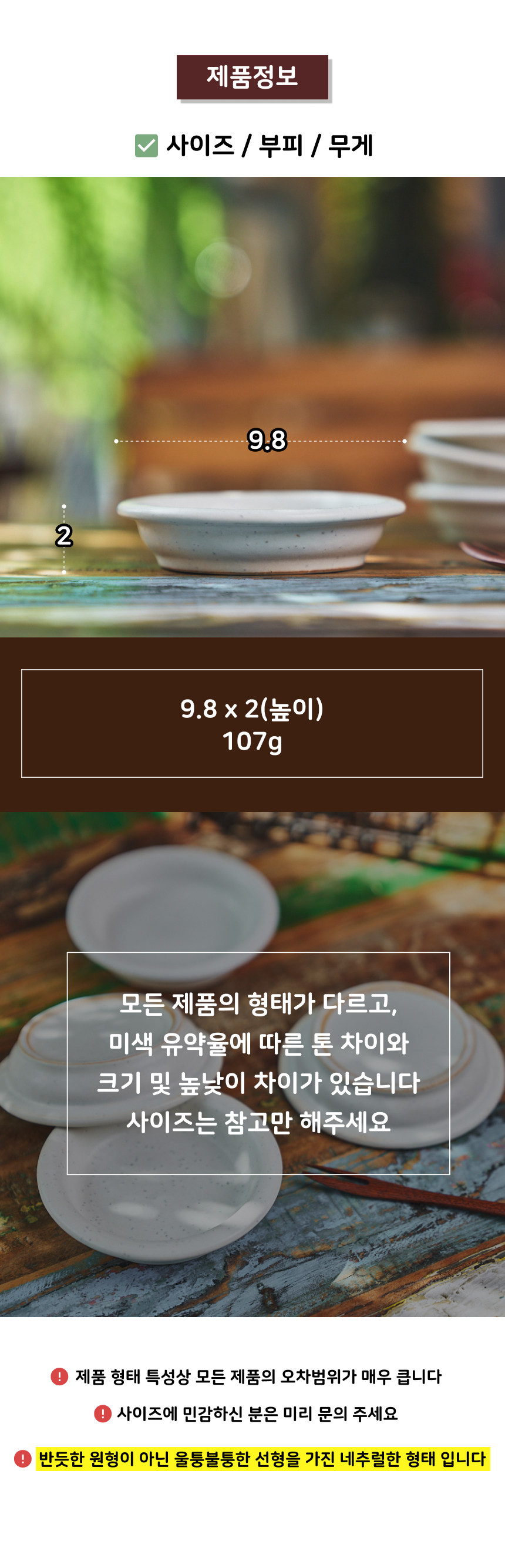 • 가마에서 나올때마다 차이가 있으니, 기계 공산품처럼 깔끔하고 딱 떨어지는 제품을 원하시는 분들께는 구매를 추천드리지 않습니다.