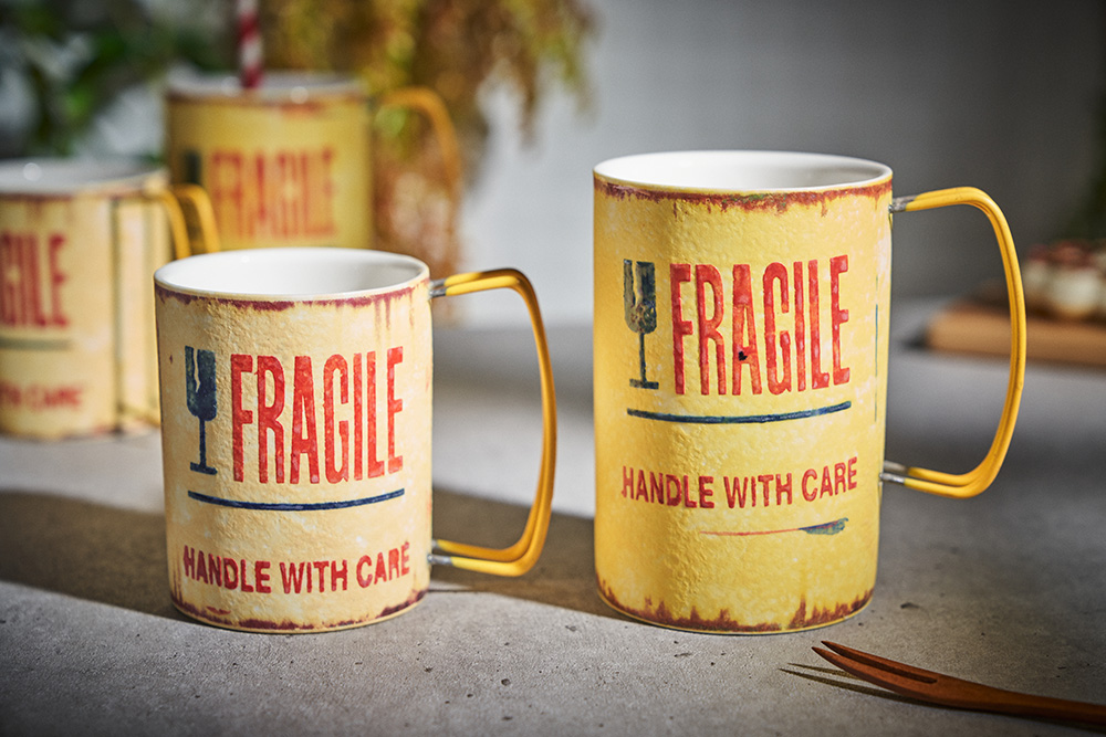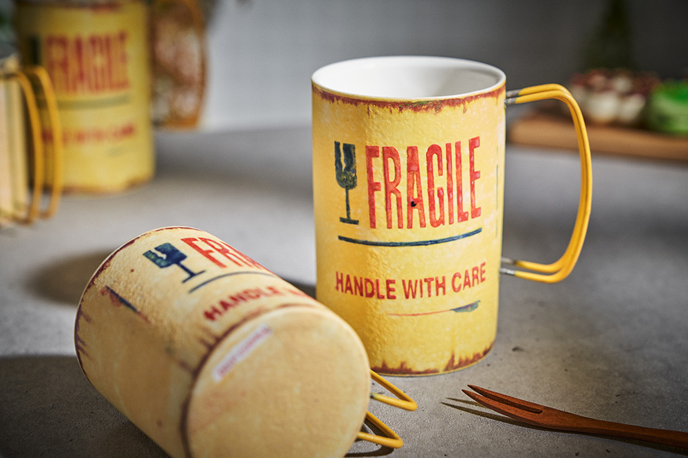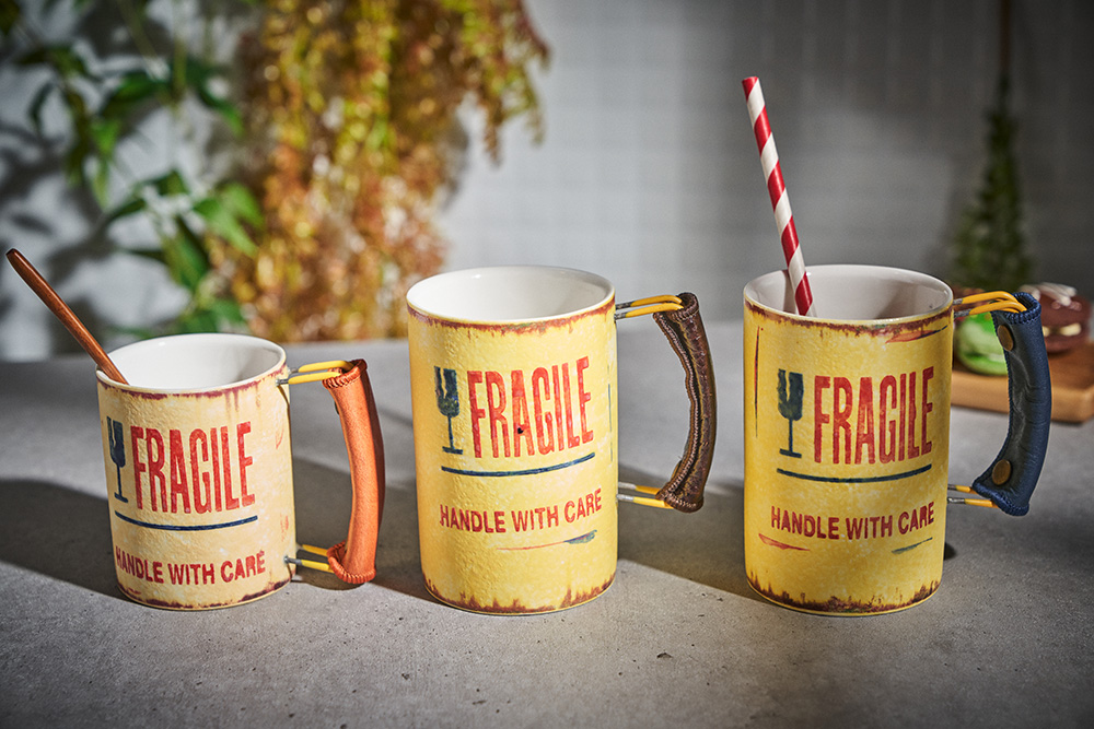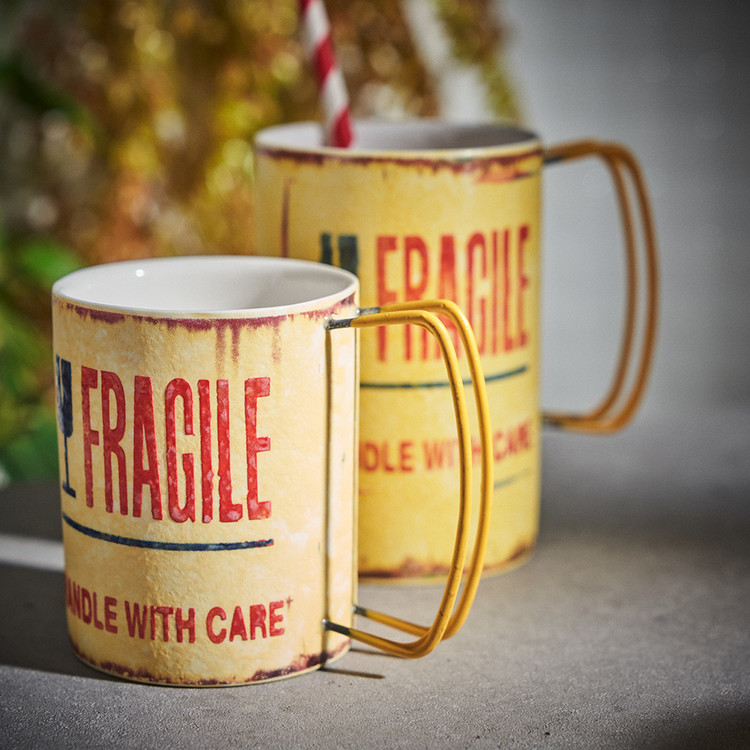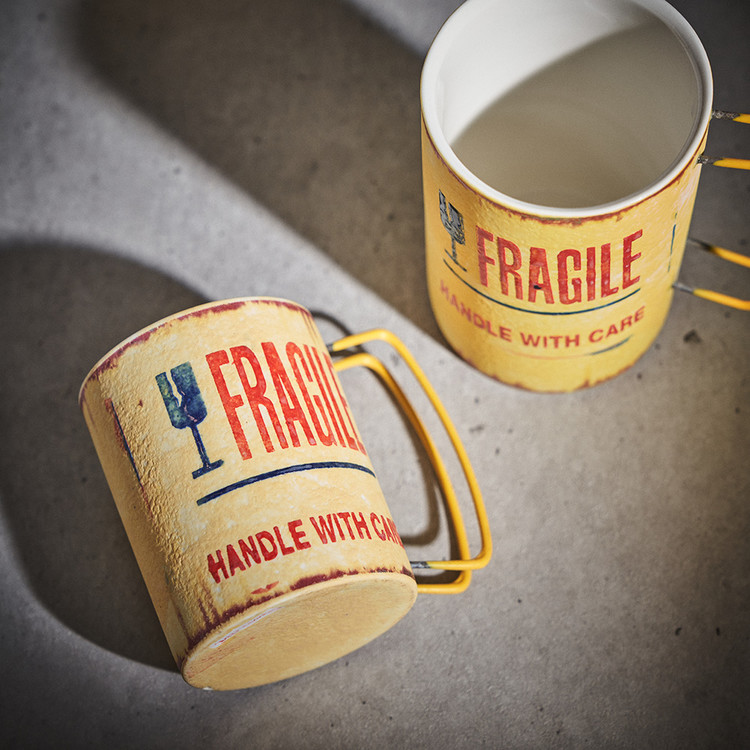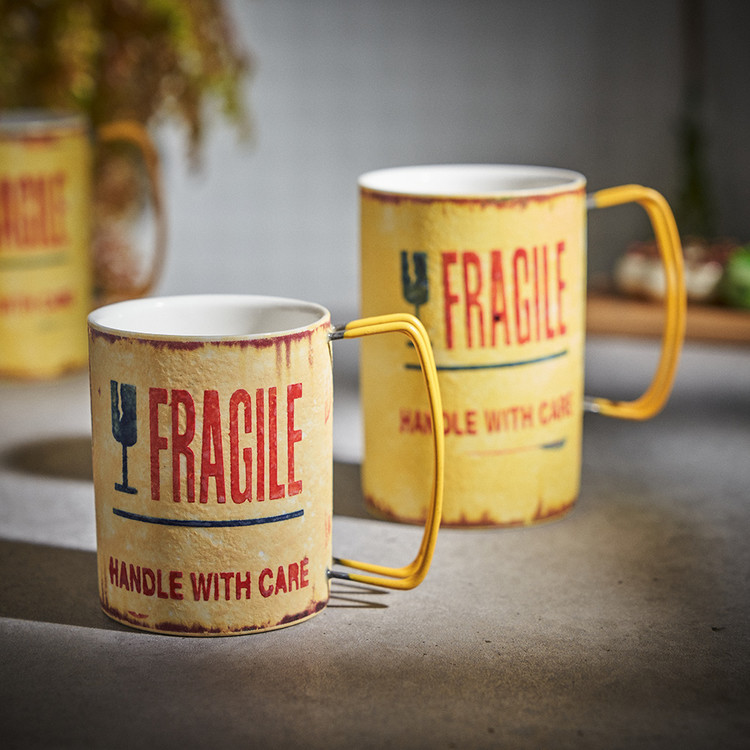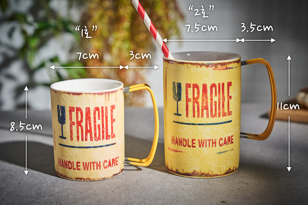 현상화 작가 ( 딥코발트 ) ' Fragile '빈티지한 느낌의 레트로 머그 디자인 옐로우 레드 포인트 취향 및 용도에 따른 사이즈 선택커피, 음료, 물컵 등 다양한 활용 |