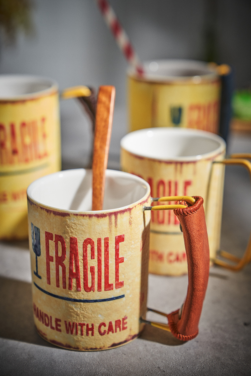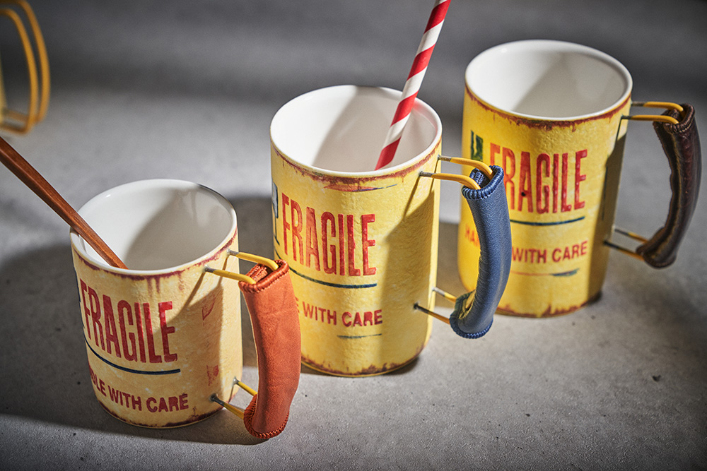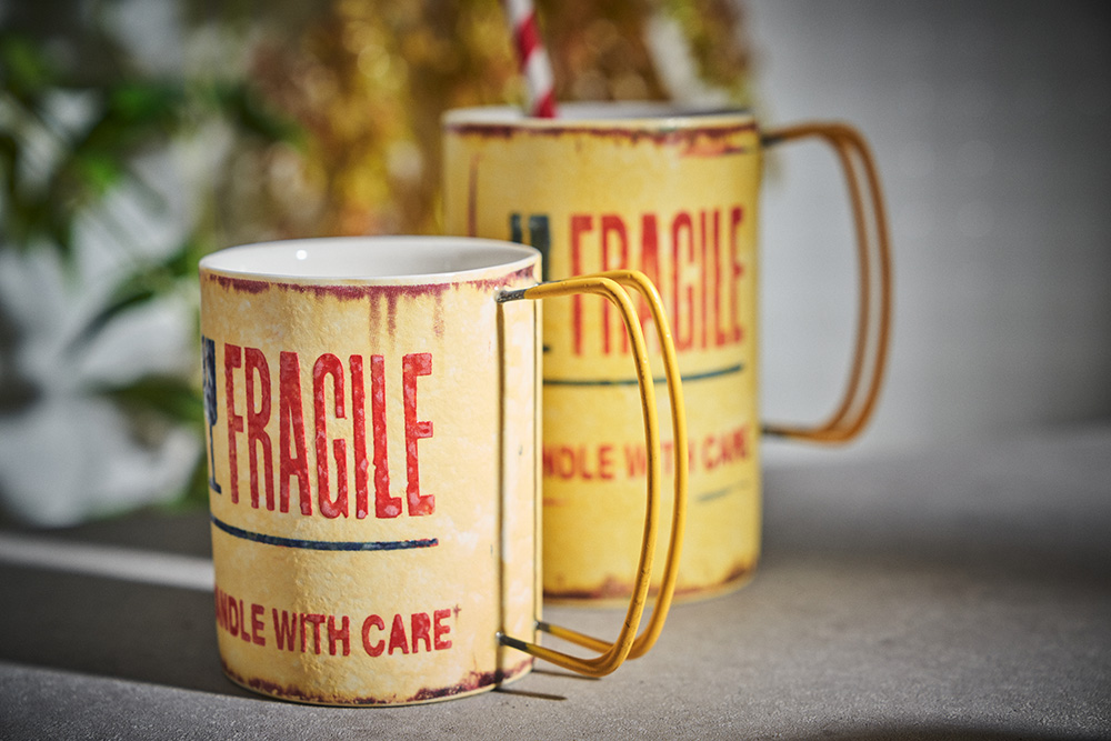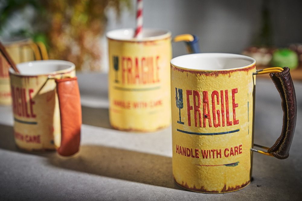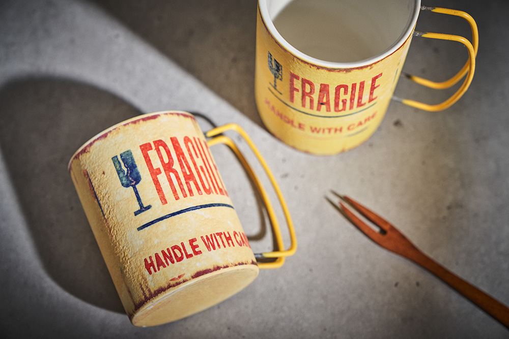 현상화 작가 ( 딥코발트 ) ' Fragile '빈티지한 느낌의 레트로 머그 디자인 옐로우 레드 포인트 취향 및 용도에 따른 사이즈 선택커피, 음료, 물컵 등 다양한 활용 |