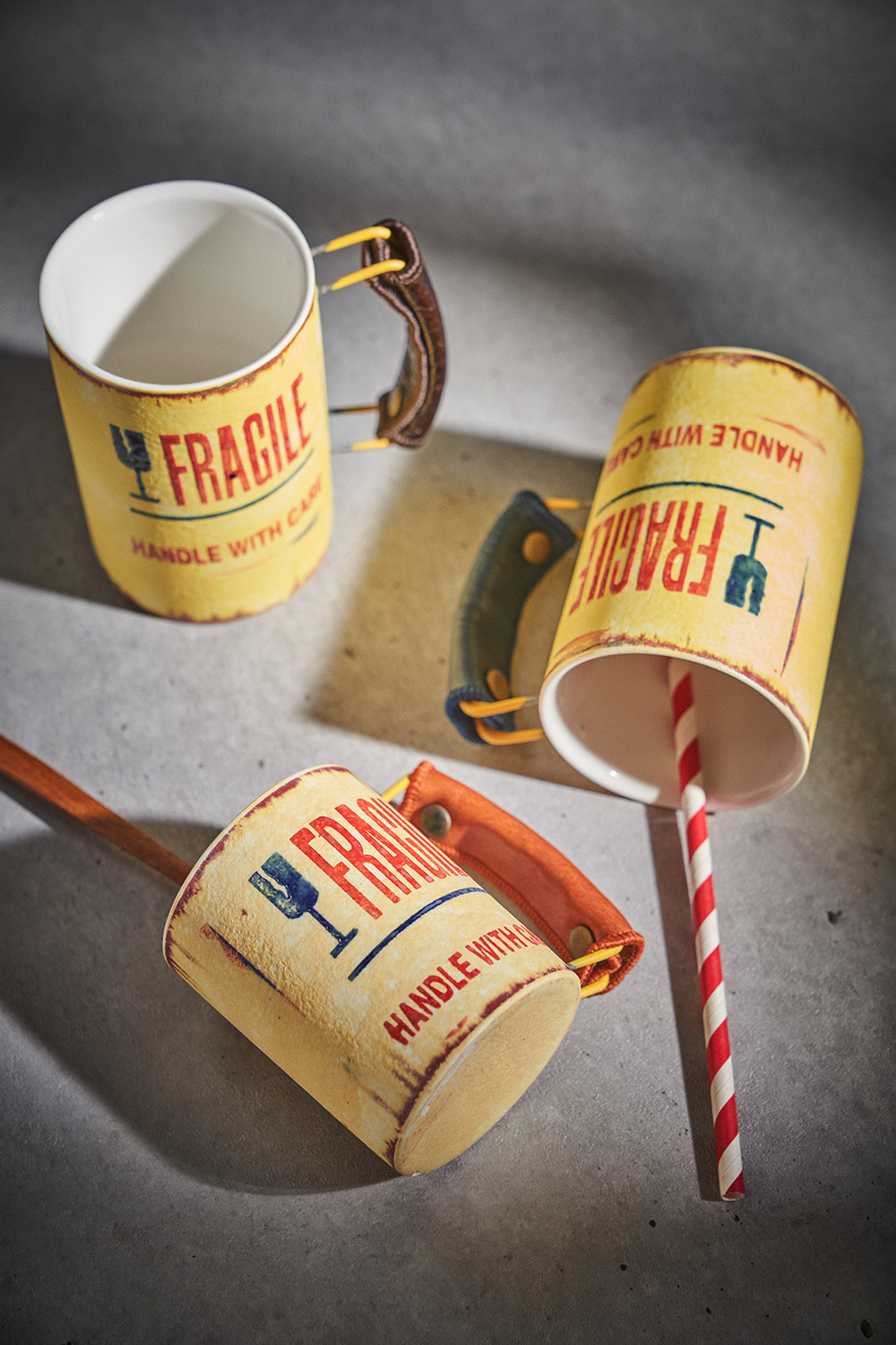 현상화 작가 ( 딥코발트 ) ' Fragile '빈티지한 느낌의 레트로 머그 디자인 옐로우 레드 포인트