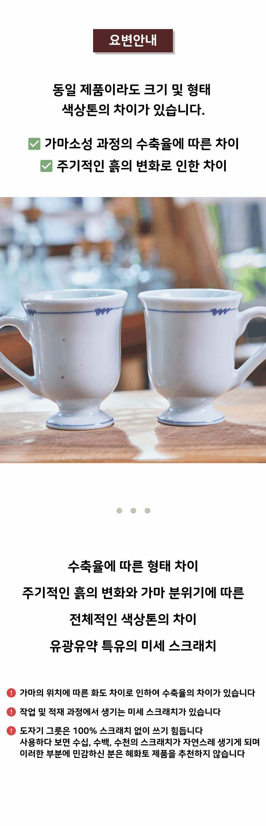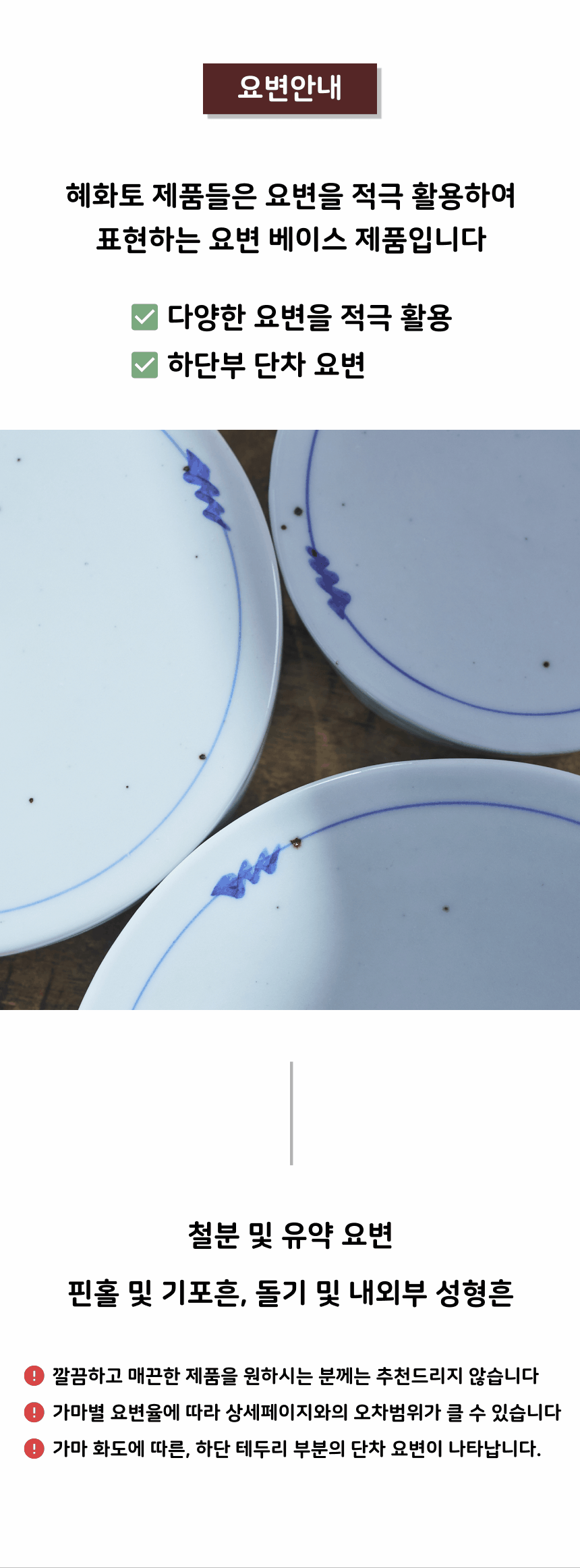 • 가마에서 나올때마다 차이가 있으니, 기계 공산품처럼 깔끔하고 딱 떨어지는 제품을 원하시는 분들께는 구매를 추천드리지 않습니다.