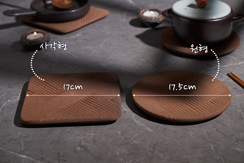 사이즈 / 부피 / 무게 핸드메이드 제품 특성상 크기, 형태, 무게 등의 차이가 있습니다.![]() 사각형 : 17 x 1.5(높이) / 500g원형 : 17.5 x 1.5(높이) / 400g 사이즈 단위 : cm | ||