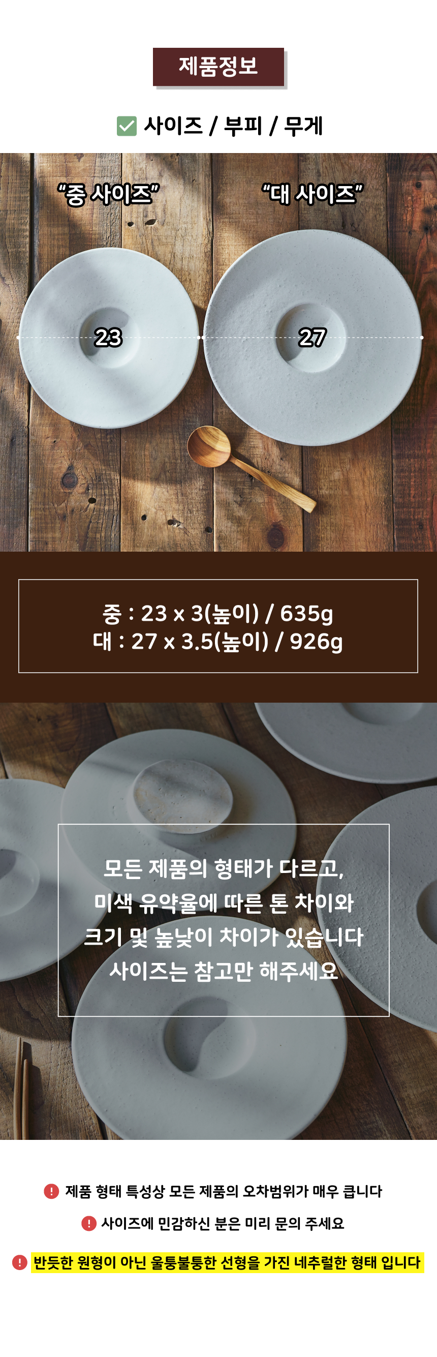 | 핸드메이드 도자기 그릇은 일반적인 공산품과 다릅니다. 가마의 분위기, 매번 달라지는 흙의 속성, 유약의 미세한 비율등 셀 수 없는 많은 요소로 인하여 끊임없이 요변이 일어나는 것이 핸드메이드 도자기 입니다. 상세 페이지와 다른 색상톤, 철분점과 돌기, 기포자국, 물레 형성자국, 가마에 닿는 바닥면의 흠집, 색배임 등등 핸드메이드 그릇 고유의 특징에 대하여 민감하신 분은 구매전 다시 한 번 고려하여 주시기 바랍니다. 온라인 쇼핑몰 특성상 사진이 본래의 제품과 100% 똑같이 나온다고 말씀드릴 순 없습니다. 항상 실제 제품과 같아 보이도록 최선을 다하고 있지만, 촬영 당시의 한 두개의 모델로 촬영된 제품과 꾸준히 생산되며 재입고되는 제품들은 요변에 따라 차이점이 날 수 밖에 없음을 이해해 주시기 바랍니다. 또한, 제품을 검색하는 모니터, 핸드폰의 종류에 따라서도 색상의 차이가 달라지니 이 점 참고하시기 바랍니다. |