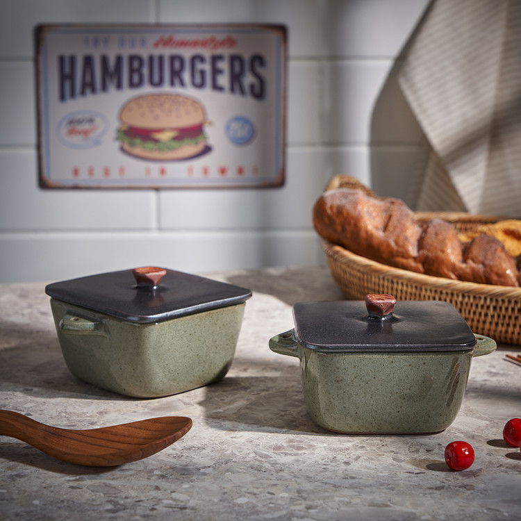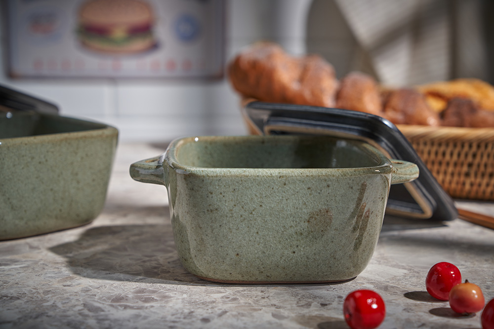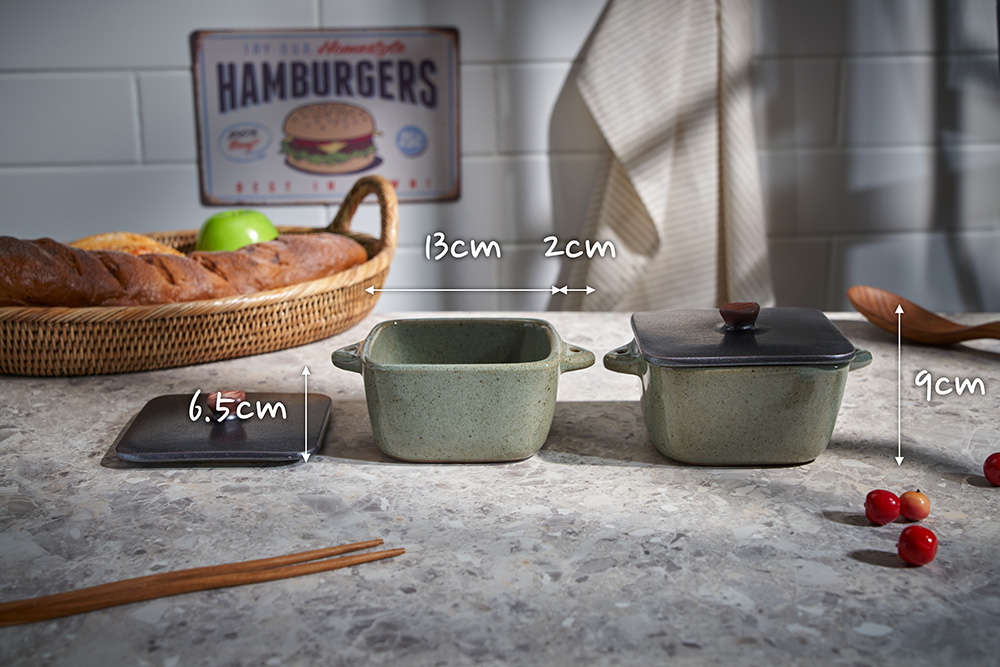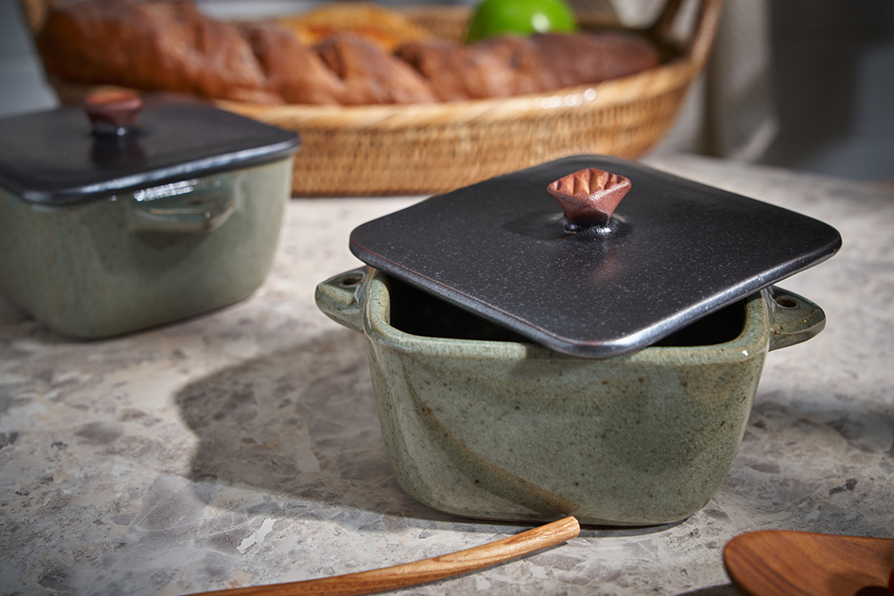 함 웅 작가 ( 토미153 ) ' 쑥색 미니 정사각 뚝배기 '유니크한 색상 배합 특이한 유광 내열자기 디자인 개성있는 정사각 형태의 아담한 뚝배기