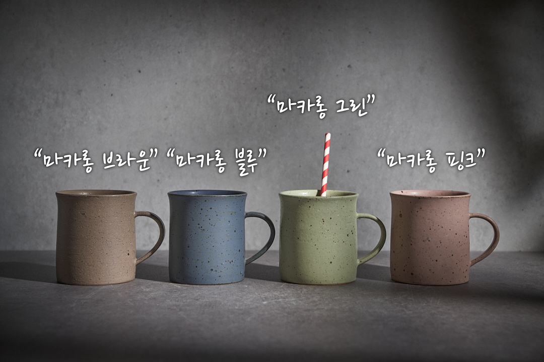 | 색상 가마에서 제작될 때 마다, 가마 분위기, 제작시 사용된 흙의 종류, 유약의 미세한 조합비율등의 차이로 인하여 색상톤의 변화가 있을 수 있습니다. 마카롱 브라운 마카롱 블루 마카롱 그린 마카롱 핑크 동일 색상이라도 핸드메이드 제품 특성상 색상톤의 차이가 있습니다. |