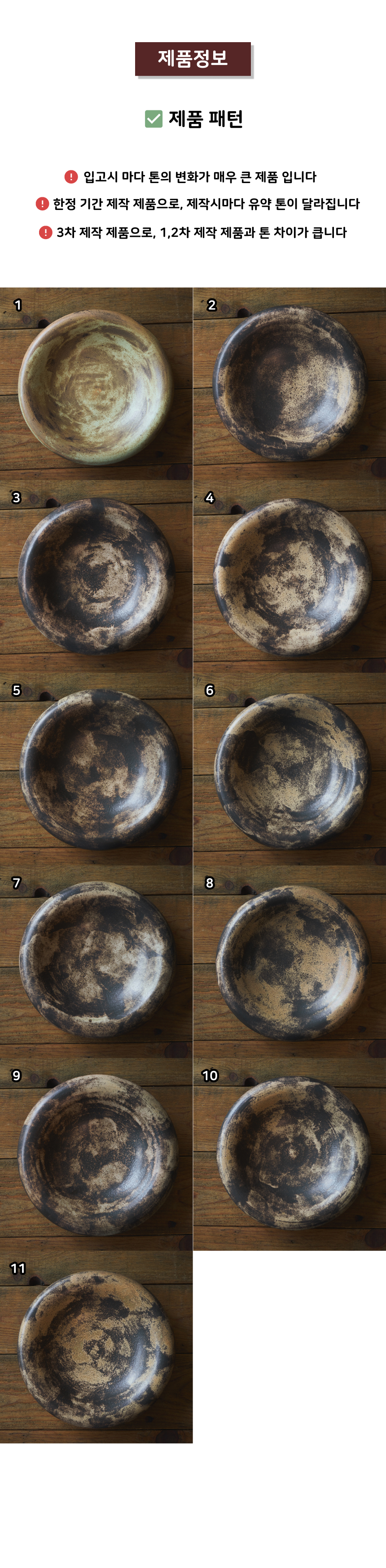 - 가마에서 나올때마다 차이가 있으니, 기계 공산품처럼 깔끔하고 딱 떨어지는 제품을 원하시는 분들께는 구매를 추천드리지 않습니다.