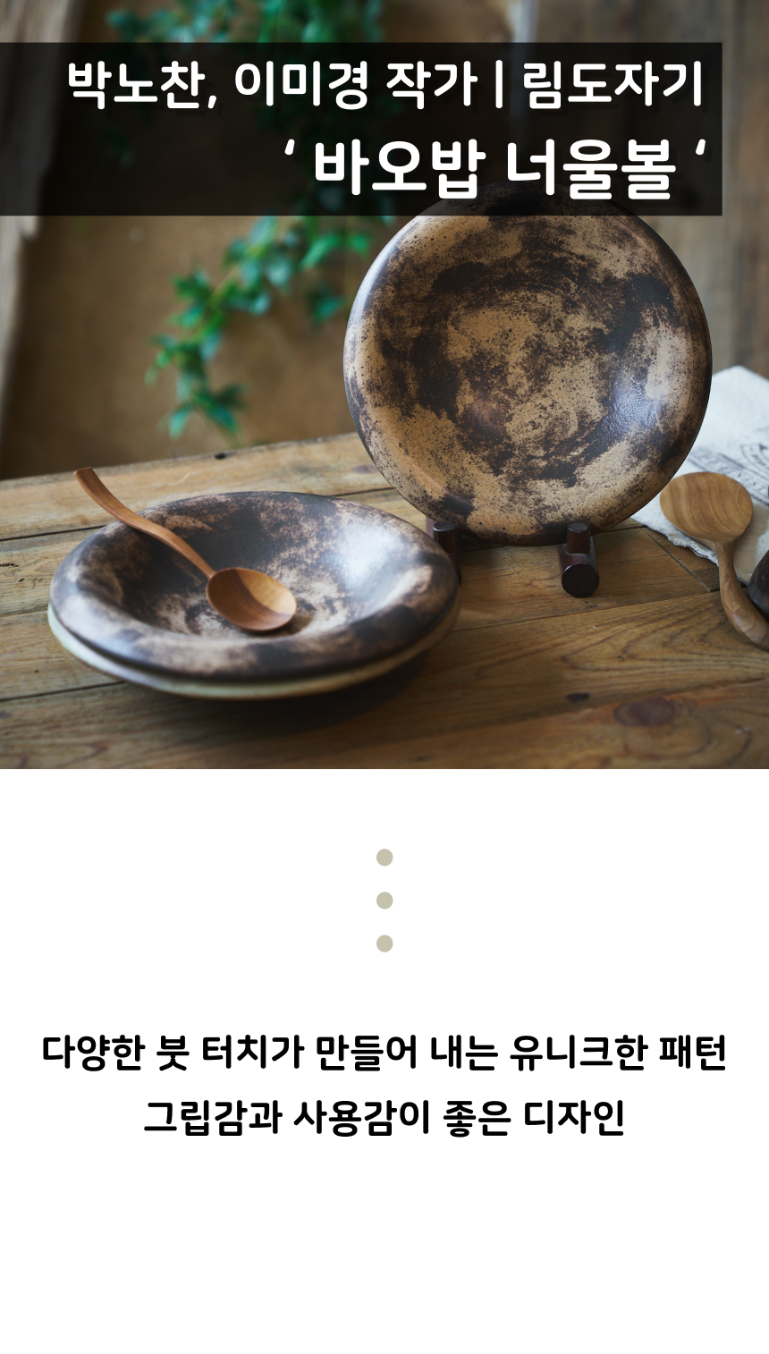 | 핸드메이드 도자기 그릇은 일반적인 공산품과 다릅니다. 가마의 분위기, 매번 달라지는 흙의 속성, 유약의 미세한 비율등 셀 수 없는 많은 요소로 인하여 끊임없이 요변이 일어나는 것이 핸드메이드 도자기 입니다. 상세 페이지와 다른 색상톤, 철분점과 돌기, 기포자국, 물레 형성자국, 가마에 닿는 바닥면의 흠집, 색배임 등등 핸드메이드 그릇 고유의 특징에 대하여 민감하신 분은 구매전 다시 한 번 고려하여 주시기 바랍니다. 온라인 쇼핑몰 특성상 사진이 본래의 제품과 100% 똑같이 나온다고 말씀드릴 순 없습니다. 항상 실제 제품과 같아 보이도록 최선을 다하고 있지만, 촬영 당시의 한 두개의 모델로 촬영된 제품과 꾸준히 생산되며 재입고되는 제품들은 요변에 따라 차이점이 날 수 밖에 없음을 이해해 주시기 바랍니다. 또한, 제품을 검색하는 모니터, 핸드폰의 종류에 따라서도 색상의 차이가 달라지니 이 점 참고하시기 바랍니다. |